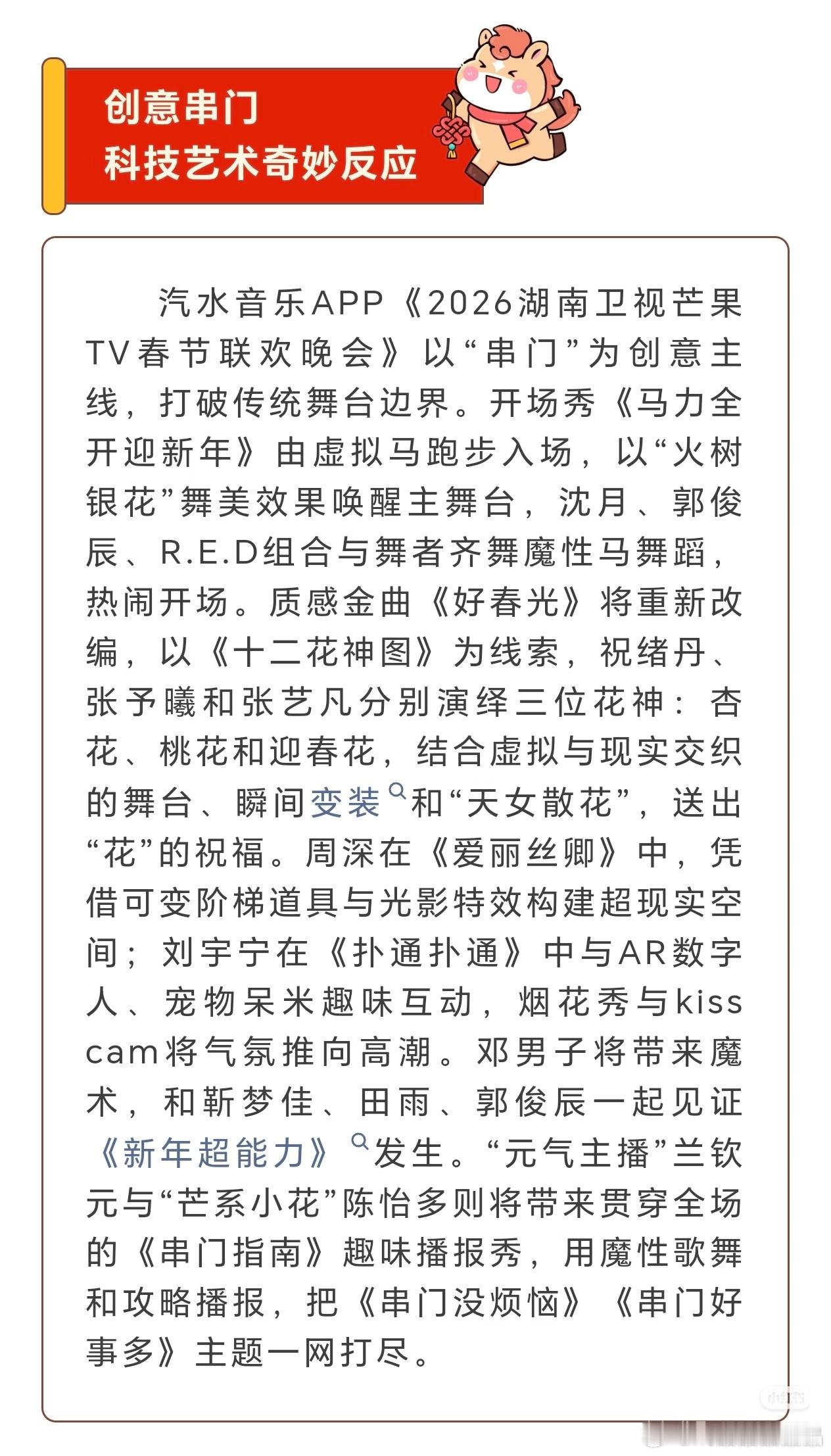 湖南卫视小年夜晚会的看点很多啊,和汽水音乐app合作的,论创意,湖南台真的不错。