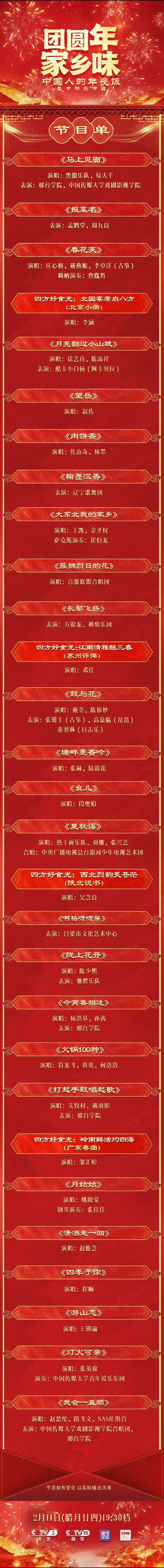 中国人的年夜饭节目单烟火起,年味至,歌声与佳肴共赴团圆。《团圆年・家乡味——中国人的年夜饭》节目单全新揭晓,2月11日19:30暖心开席,用乡音叙温情,用美食暖人心,共度最有年味的新春夜晚。团圆年家乡味中国人的年夜饭