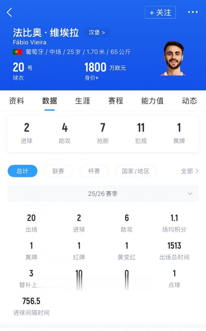 直播吧02月11日讯据德媒《图片报》报道,本赛季外租至汉堡的阿森纳中场法比奥·维埃拉渐入佳境,但球队不太可能触发2000万欧元的买断条款。