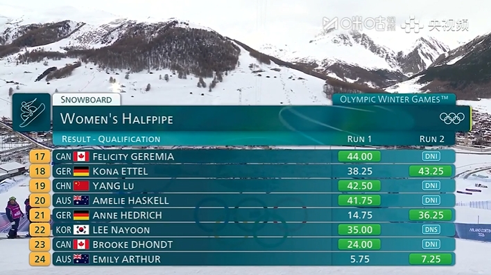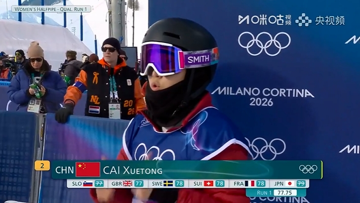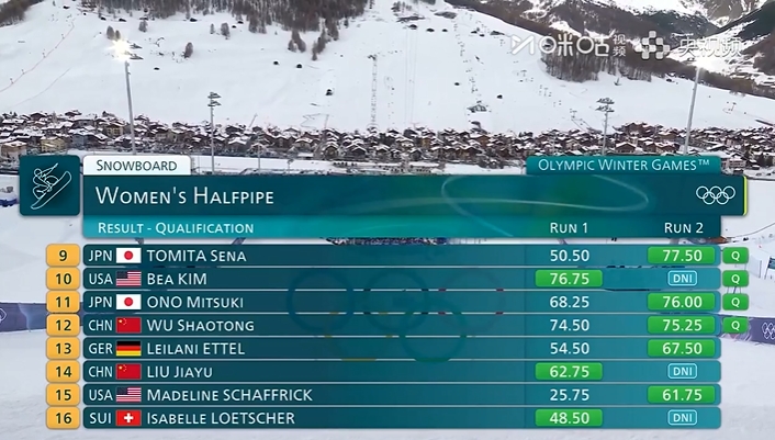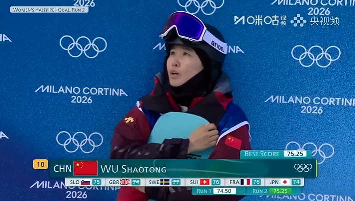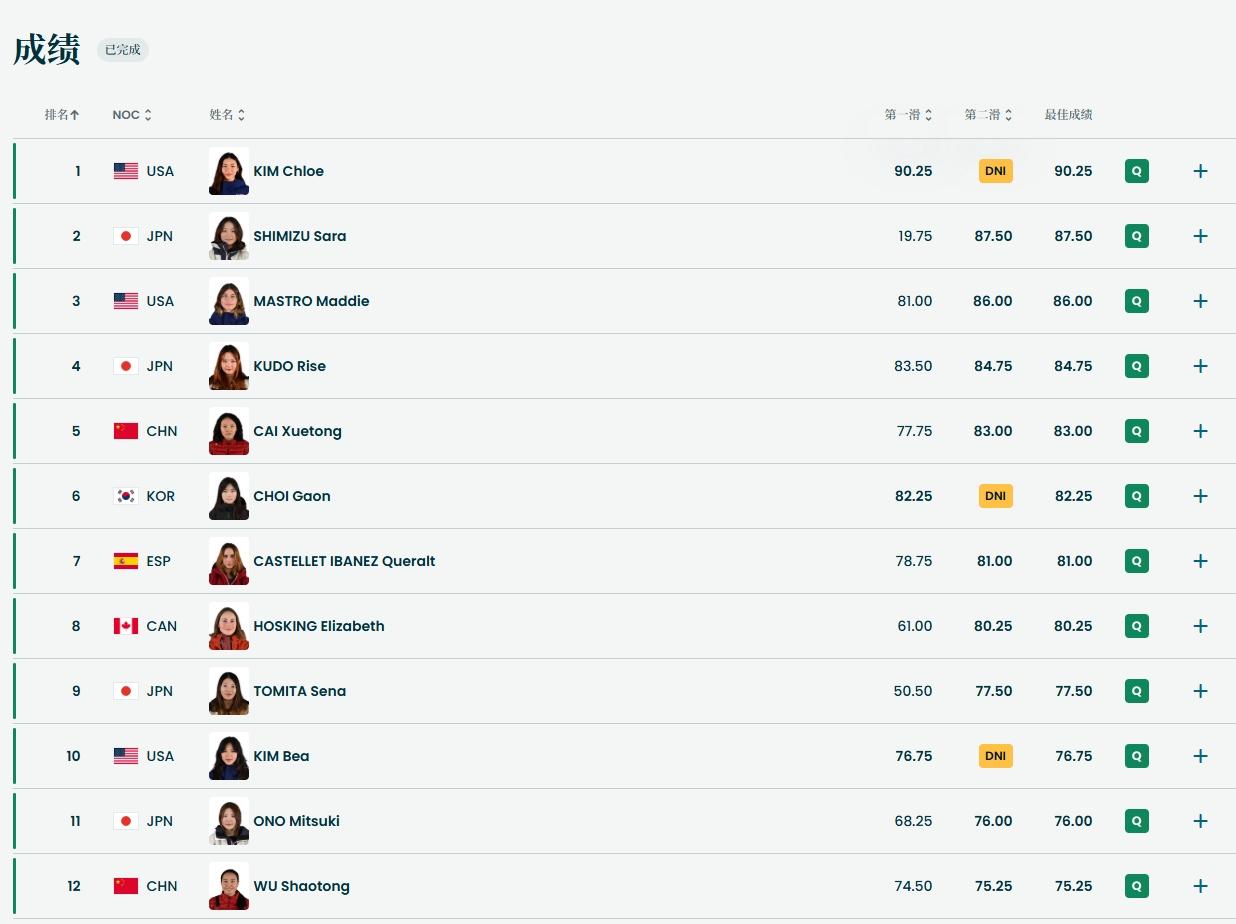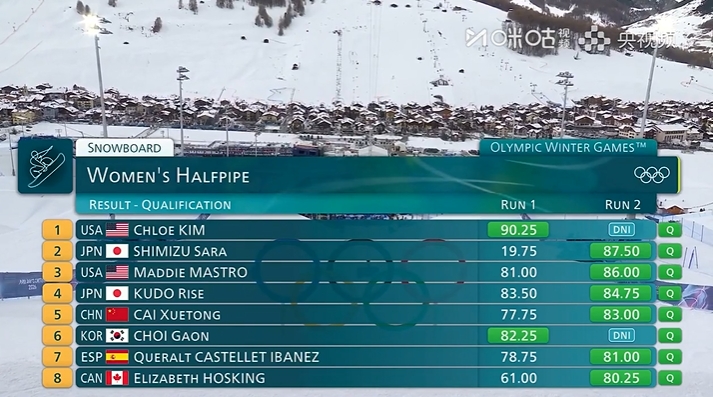 直播吧02月11日讯米兰冬奥会单板滑雪女子U型场地技巧预赛,蔡雪桐、武绍桐预赛第5、第12晋级,刘佳宇、杨露遗憾止步决赛,美国选手克洛伊·金90.25分位列预赛第一。