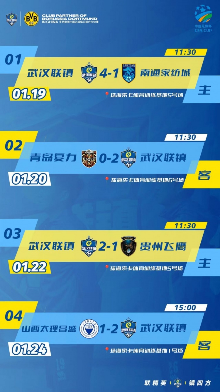 此外,武汉联镇在近日的足协杯预选赛珠海赛区中,又4场全胜,成功收获正赛入场券。