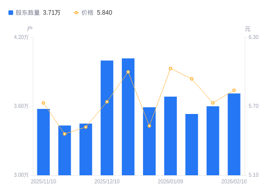 日期A股户数(户)流通A股户均持股数(股)户均持股市值(万元)2026-02-103712931477.0818.382026-01-303601432451.6118.592026-01-203534333067.7219.642026-01-093684831717.1219.132025-12-313592632531.1017.992025-12-194018029086.9217.452025-12-103998929225.8516.782025-11-303449733878.6718.702025-11-203433734036.5318.582025-11-103577732666.5818.72