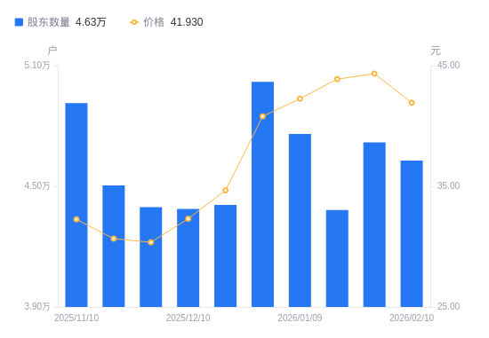 日期A股户数(户)流通A股户均持股数(股)户均持股市值(万元)2026-02-10462839152.7238.382026-01-30471878977.3739.812026-01-20438189667.6142.422026-01-09475988899.8537.612025-12-31501918440.0634.442025-12-19440749611.4533.312025-12-10438759655.0531.202025-11-28439649635.5029.252025-11-20450419405.1028.842025-11-10491348621.6327.81