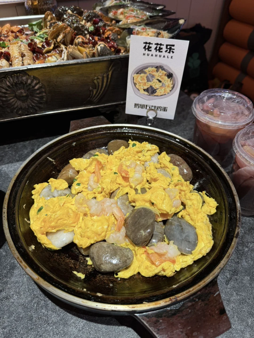 鹅卵石炒鸡蛋仪式感拉满,调好的蛋液直接浇在滚烫的鹅卵石上,滋滋作响超有氛围感,炒出来的鸡蛋嫩到抿嘴,鲜香味超浓~