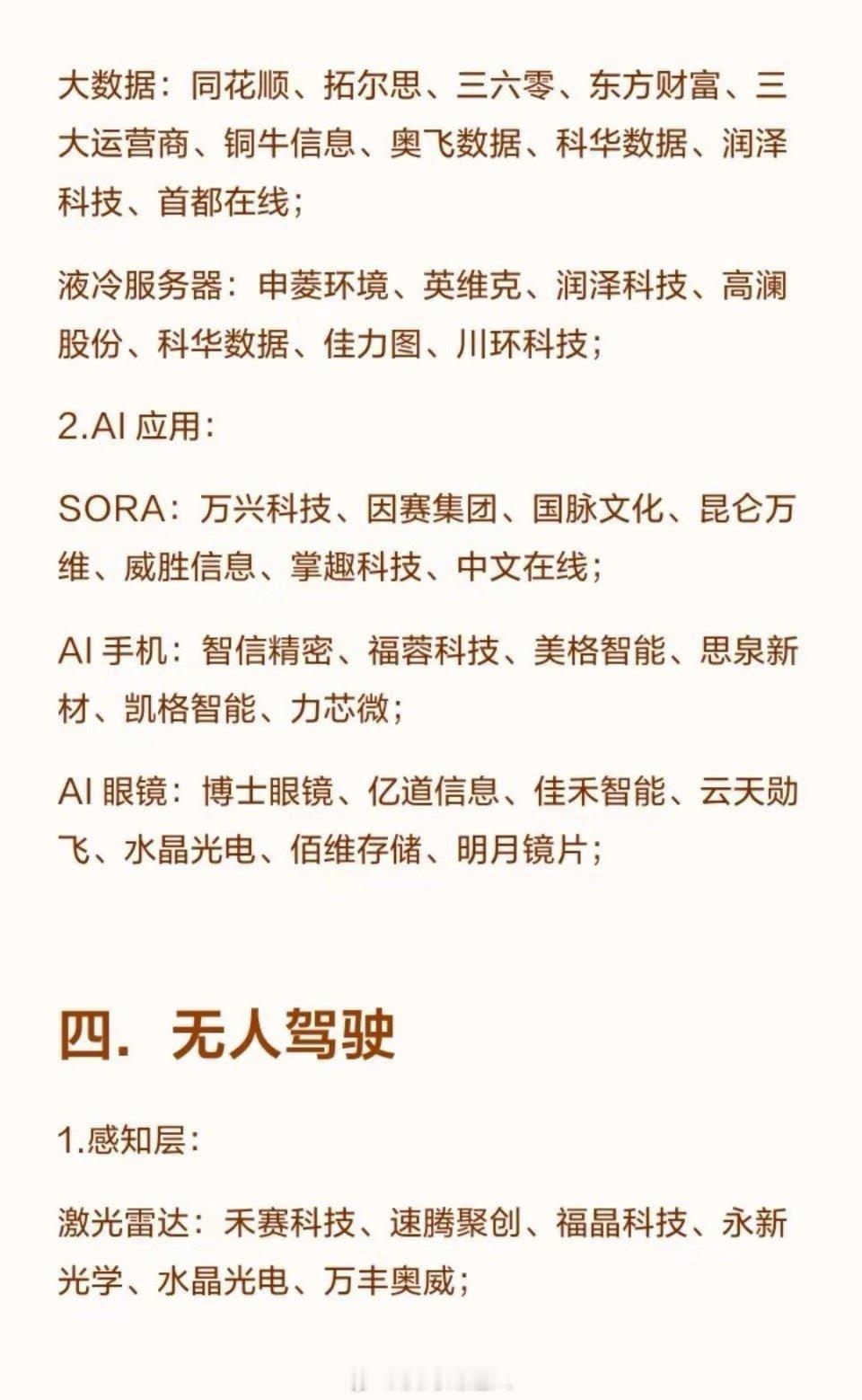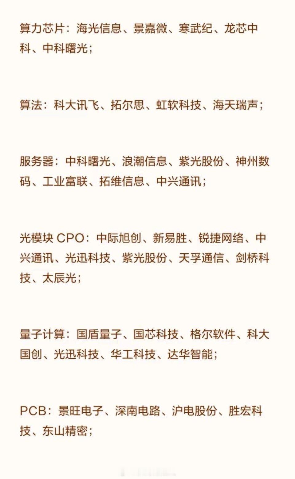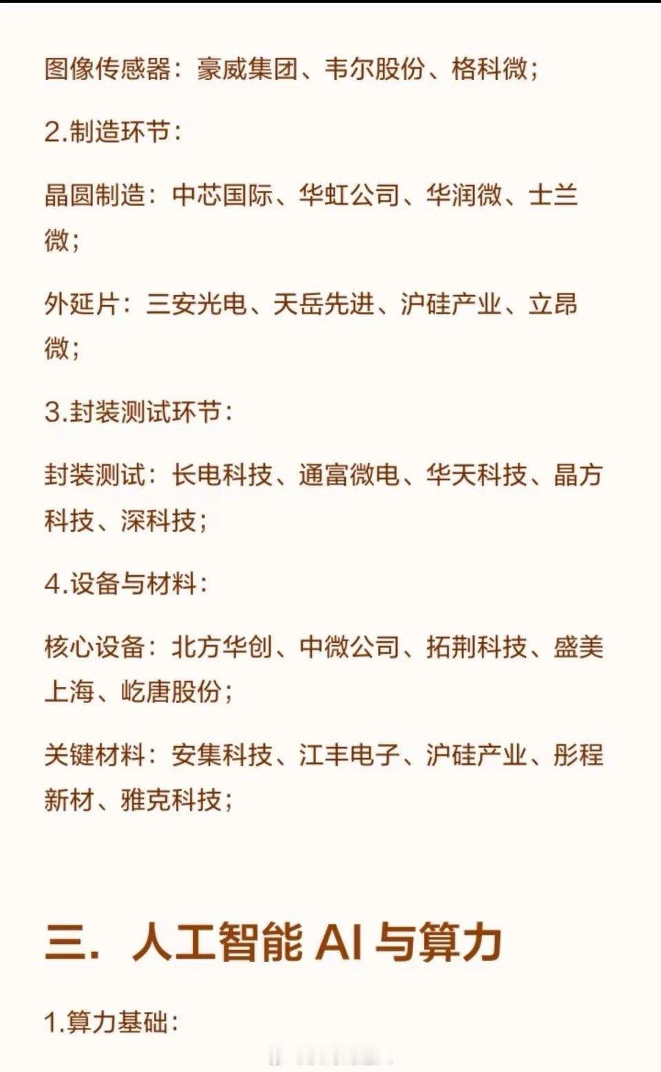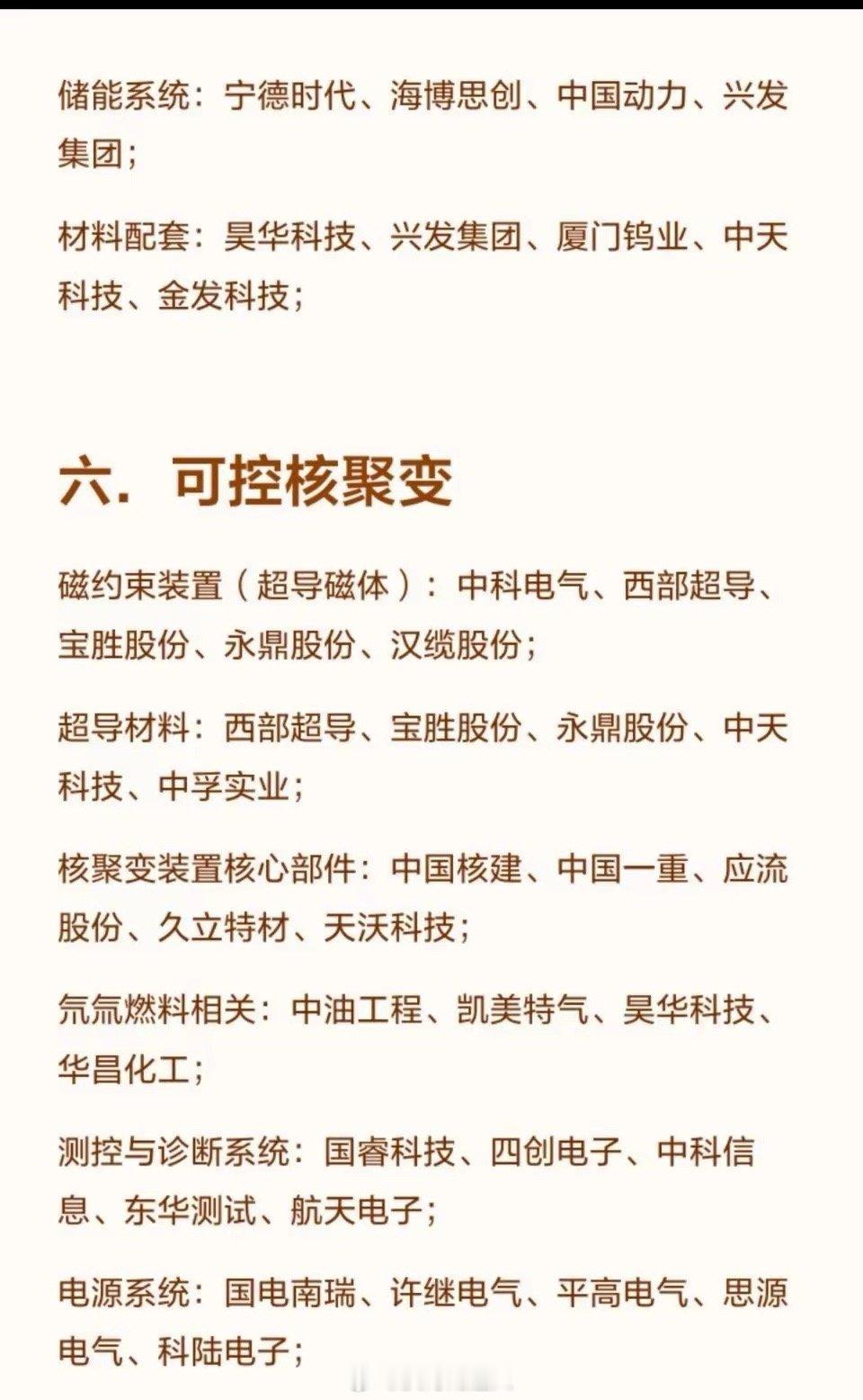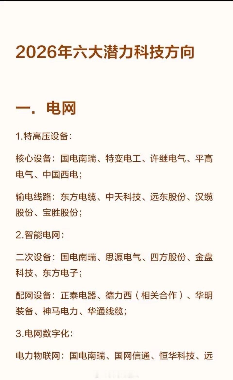 2026年六大潜力科技方向2026年六大潜力科技方向一.电网1.特高压设备:核心设备:国电南瑞、特变电工、许继电气、平高电气、中国西电;输电线路:东方电缆、中天科技、远东股份、汉缆股份、宝胜股份;2.智能电网:二次设备:国电南瑞、思源电气、四方股份、金盘科技、东方电子;配网设备:正泰电器、德力西(相关合作)、华明装备、神马电力、华通线缆;3.电网数字化:电力物联网:国电南瑞、国网信通、恒华科技、远光软件、海兴电力;虚拟电厂:国电南瑞、恒实科技、金智科技、国网信通;4.储能与配套:储能设备:宁德时代、国电南瑞、许继电气、特锐德、金盘科技;电气元件:宏发股份、汇川技术、良信股份、正泰电器、三星医疗;二.芯片半导体1.设计环节:逻辑芯片:寒武纪、海光信息、澜起科技、兆易创新、瑞芯微;存储芯片:兆易创新、佰维存储、长江存储(相关合作)、长鑫存储(相关合作);功率半导体:士兰微、斯达半导、扬杰科技、安世半导体(相关合作);图像传感器:豪威集团、韦尔股份、格科微;2.制造环节:晶圆制造:中芯国际、华虹公司、华润微、士兰微;外延片:三安光电、天岳先进、沪硅产业、立昂微;3.封装测试环节:封装测试:长电科技、通富微电、华天科技、晶方科技、深科技;4.设备与材料:核心设备:北方华创、中微公司、拓荆科技、盛美上海、屹唐股份;关键材料:安集科技、江丰电子、沪硅产业、彤程新材、雅克科技;