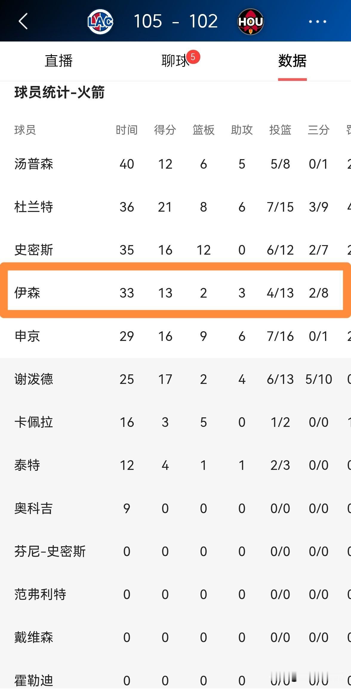 火箭大将伊森真是神一场鬼一场!在今天火箭主场以102:105输给快船的比赛中,伊