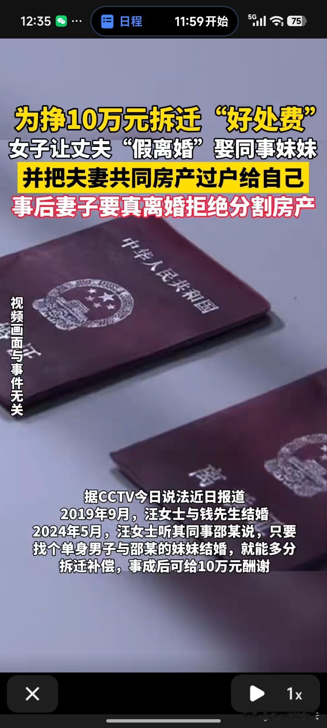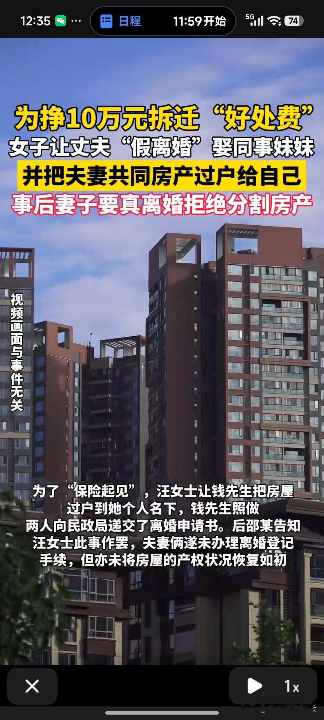 女子让丈夫和她假离婚,和同事的妹妹结婚。她说同事告诉她,他妹妹是单身,如果有配偶就能得到更多的拆迁款,事后会给他们10万的好处费。 在女子的劝说下,丈夫也心动了。女子说为了保证他们的利益,把夫妻共同的房子先过户到她名下,当时夫妻感情挺好,丈夫也同意了。 后来这件事没弄成,可是房子却过户到了女方名下,也还再改过来。这件事过去一年后,女子主动向法院起诉离婚,她要求分割丈夫名下的一处房产。 丈夫同意离婚,但是他觉得既然分割我的房子,那以前过户到妻子名下的房子也得分割,女子不同意,女子说那个房子是她的个人财产。 其实女方名下的那套房子,就是当初他们要假离婚时,过户到她名下的那套。 这下男子该反应过来了吧,哪有什么假离婚赚手续费这样的好事?这很可能就是妻子的早有预谋。 为什么房子过户到她名下不到一年,她就主动提离婚了?这难道是巧合吗? 我觉得夫妻之间,不管男女,只要有一方提到假离婚,另一方就要小心了! 对于这件事,你怎么看呢?