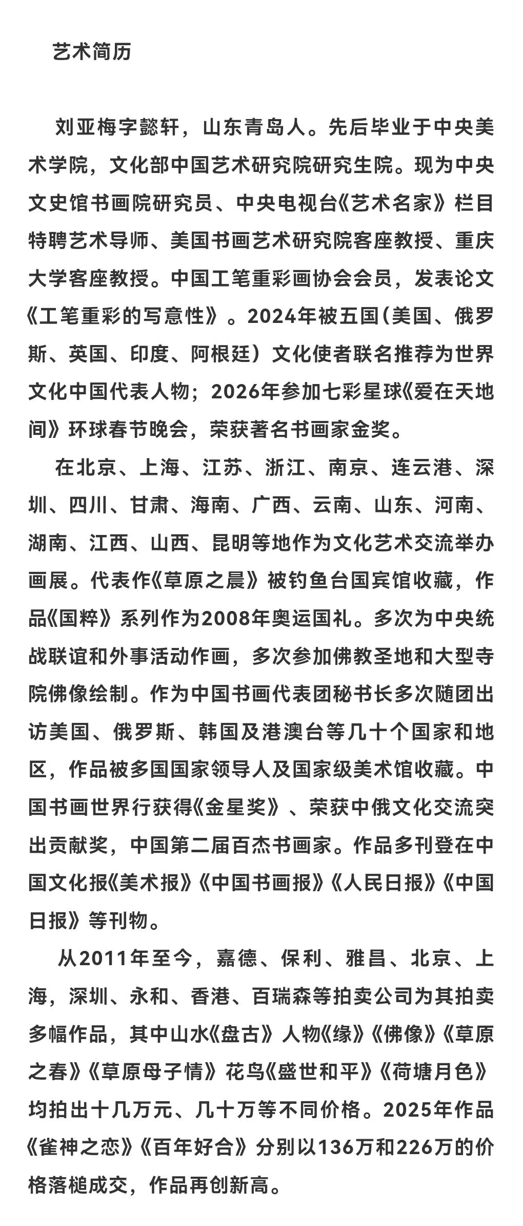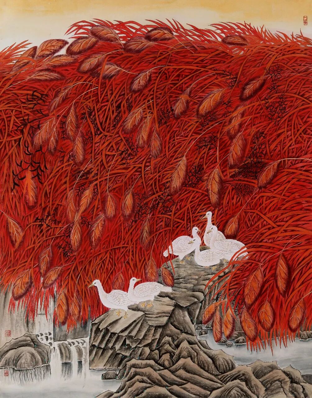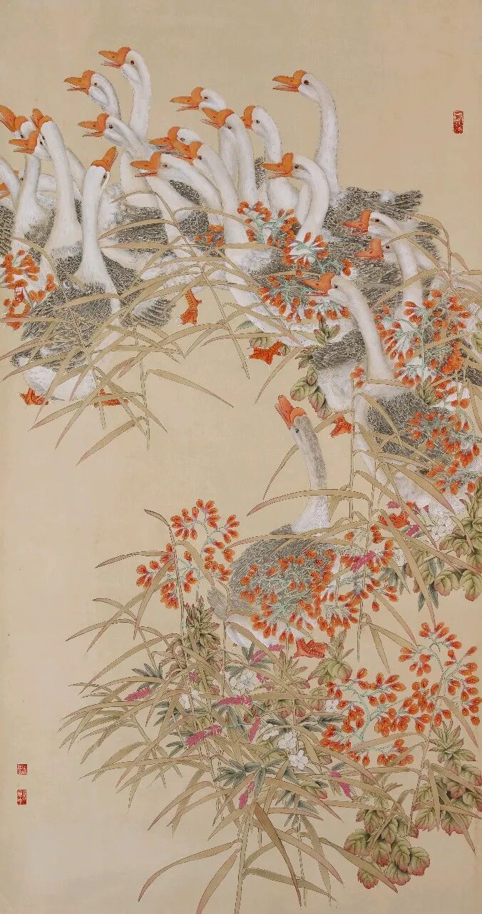 从精神内涵来看,作品中既蕴含着“天人合一”的东方哲学,传递着人与自然和谐共生的理念,也承载着吉祥、美好、繁荣的传统吉祥文化精神;同时,她以当代人的审美视角解读传统,让古老的工笔花鸟艺术不再局限于复古,而是成为展现时代精神、传递文化自信的载体,每一幅作品都是对生命之美、自然之美、文化之美的深情礼赞。刘亚梅的工笔花鸟画,以精湛的技法、浓郁的色彩、空灵的意境与鲜活的精神,在传统与现代之间找到了平衡。她的作品不仅是对自然花鸟的艺术再现,更是对东方美学精神的当代诠释,既坚守了工笔重彩的传统根脉,又以创新的表达拓展了当代工笔花鸟画的艺术边界,让传统工笔花鸟在新时代焕发出独特的艺术魅力与文化价值。