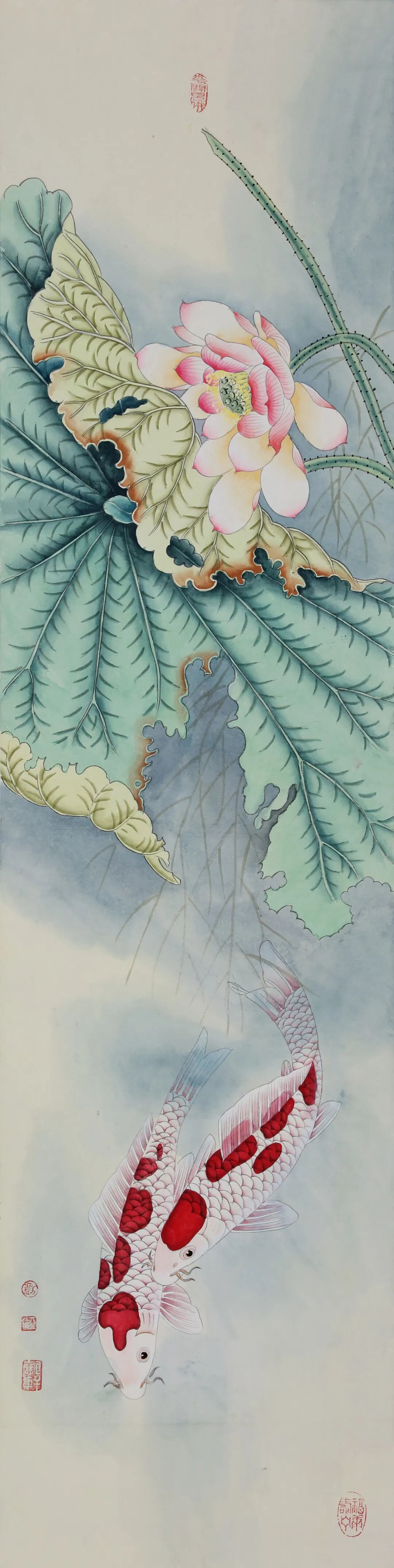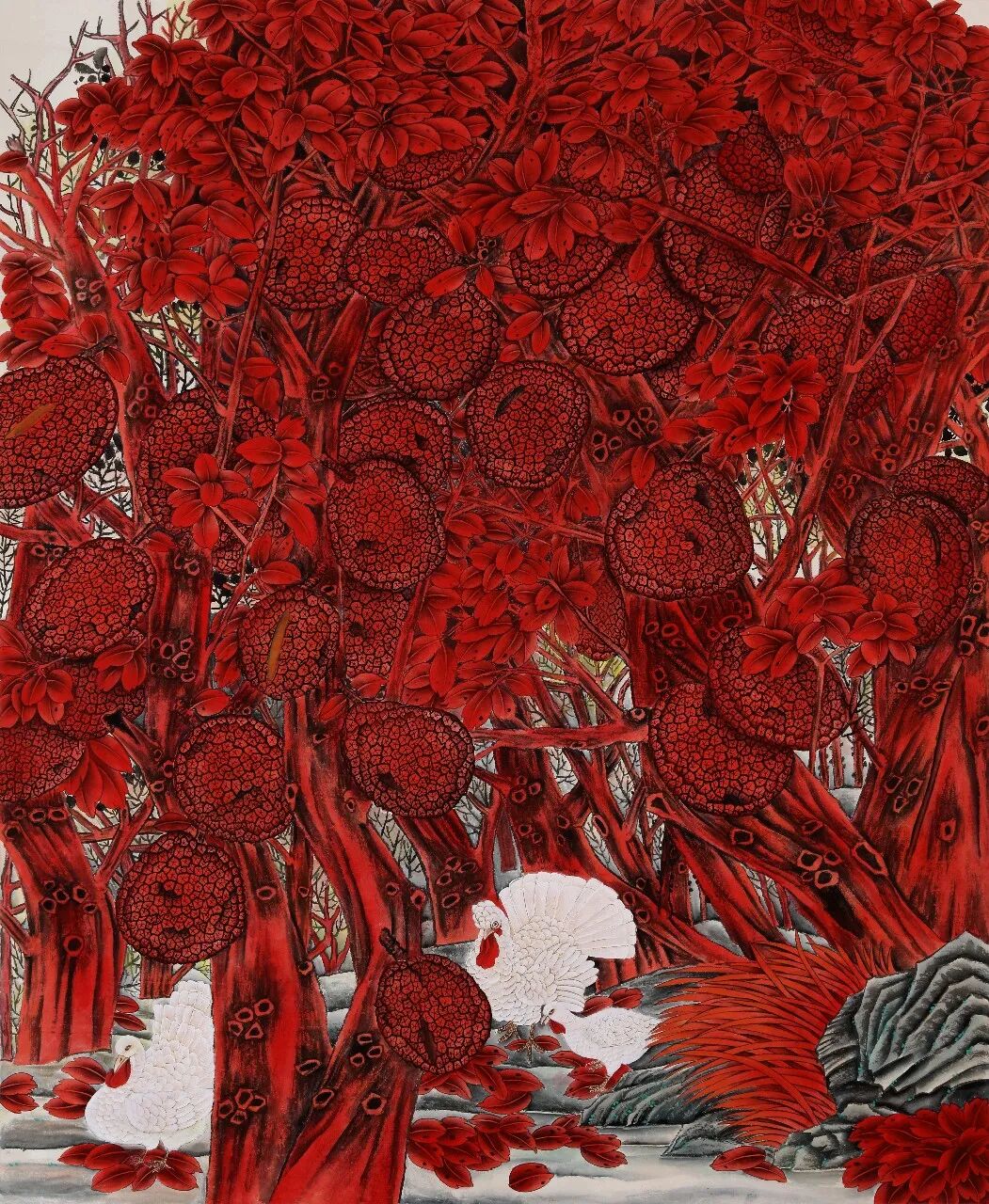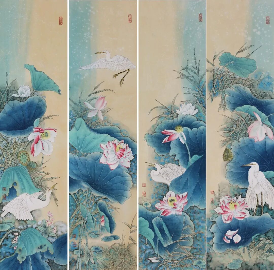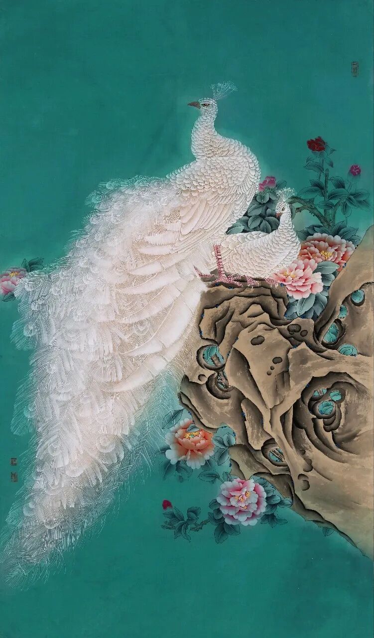 设色是其工笔花鸟最鲜明的艺术语言,她深耕传统矿物质颜料的运用,遵循“随类赋彩”的古训,以层层晕染的技法铺陈色彩。色彩浓郁饱满却不失雅致,重彩之中见清润,艳而不俗、浓而不腻,既保留矿物质颜料独有的厚重质感与古典韵味,又通过色彩的冷暖对比、浓淡过渡,营造出丰富的视觉层次;同时注重色与墨的交融共生,“色不碍墨、墨不掩色”,让色彩的艳丽与墨色的温润相互映衬,赋予画面深沉而高贵的艺术格调,让重彩成为传递东方美学精神的重要载体。