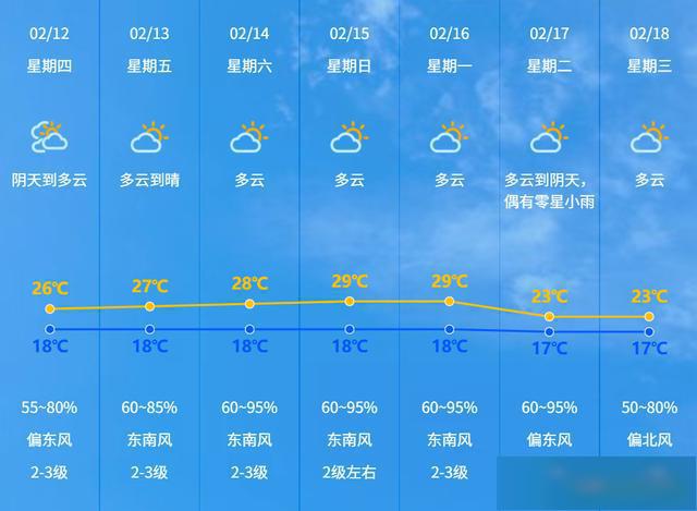 预计12-13日中山多云为主,14-16日中山气温继续回升,湿度增加,早晚有轻雾,展望17-18日(春节前期)起受弱冷空气影响,气温略有下降。目前正值春运,请注意交通安全。天气变化节奏快,请注意适时添减衣物。目前中山森林火险橙色预警信号正在生效,请注意用火用电安全。
