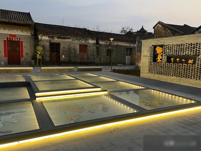 步入广场,青砖灰瓦间,屋顶巨型史努比俏皮张望,似在热情迎客。地面四周镌刻马乐山生平年表,讲述其深耕手模艺术、铸就传奇的风雨历程;中央玻璃地台内,史努比、米老鼠、岐岐鸽等卡通形象悉数呈现,尽显匠心巧思;一旁的“HELLO沙涌”装置与史努比打卡墙则将传统侨乡风貌与现代潮流元素融合,有望成为年轻人青睐的热门打卡点。