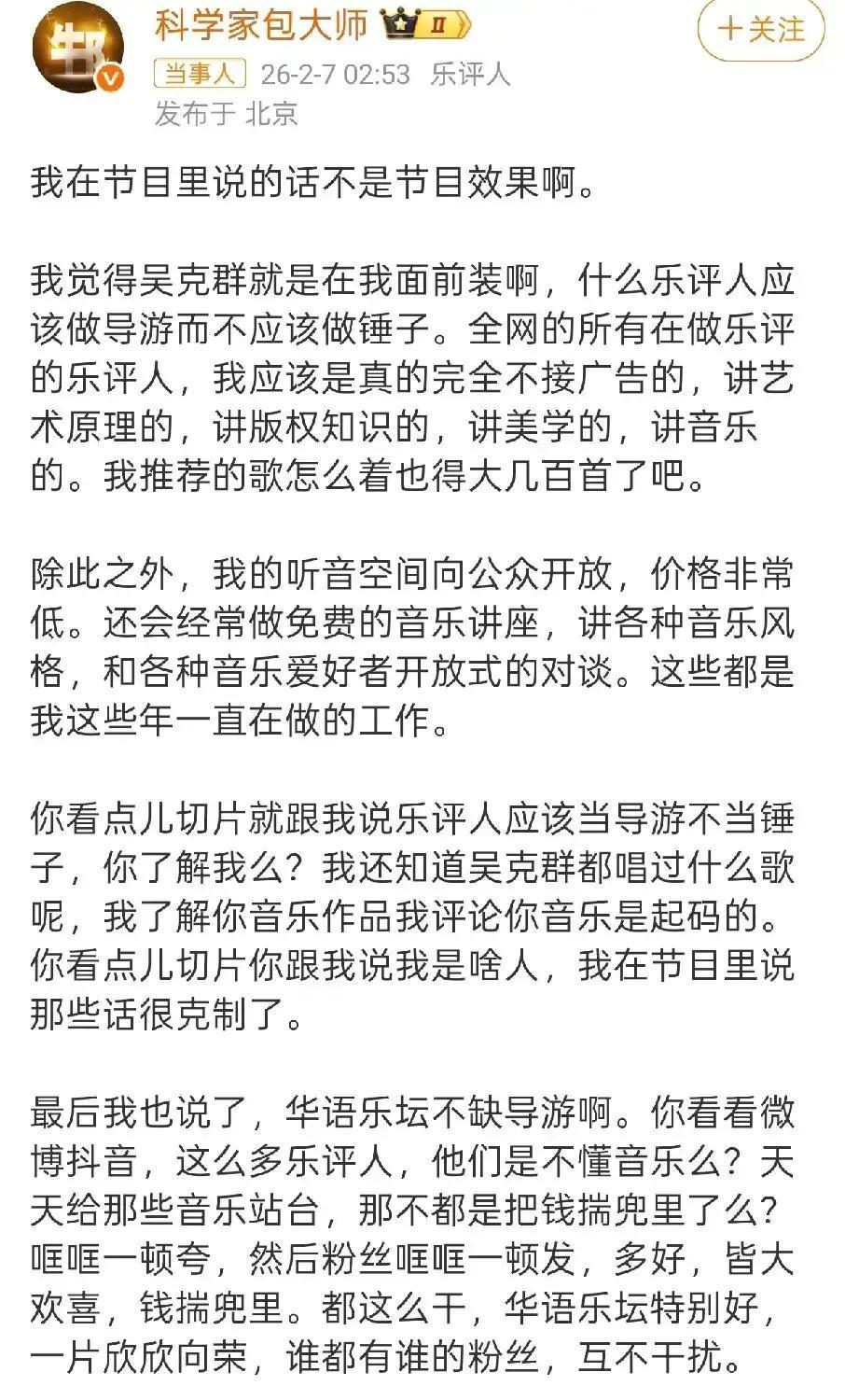 吴克群这回真急了! 一句“你行你上”,彻底把乐评人梁源架上了火,欢子在旁边尴尬得像是局外人。 音乐圈的这趟浑水,远不是“唱得好不好”那么简单。 这是创作者的表演欲和裁判席的专业性,最赤裸裸的权力对决! 凌晨长文,那是情绪的大爆发。 但真正致命的是梁源晒出的私信截图,这哪是辩论,分明是邀战! 吴克群嫌人家“拿锤子砸现场”? 现在梁源接受挑战,要用清唱版的《爱我别走》来对垒。 他要用极简主义证明什么叫“四两拨千斤”。 这个局,已经从综艺冲突,升级成了音乐理念的“生死局”。 舞台上光环再大,也抗不住台下的一句真话。 表演者和评论人,到底谁该为艺术的沉重或轻盈负责?