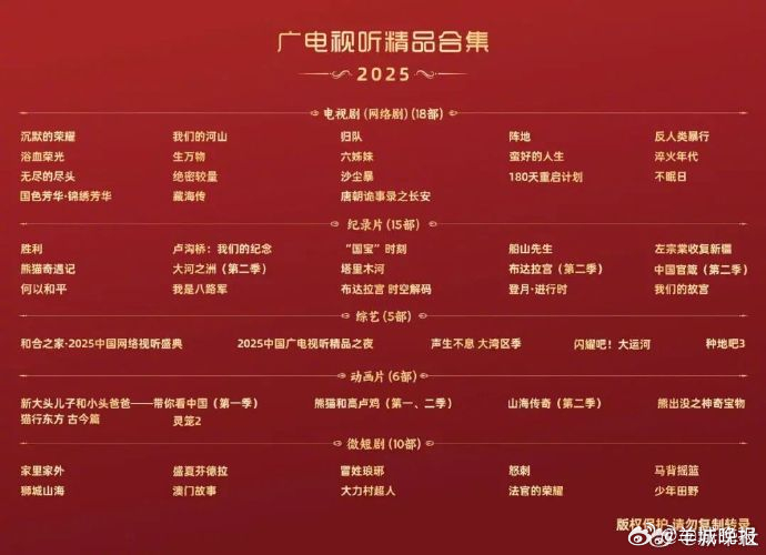 【#藏海传国色芳华等入选2025广电视听精品合集#】近日,国家广播电视总局正式发布“2025广电视听精品合集”,回顾一整年来由光影艺术构成的闪亮印记,横跨电视剧、纪录片、综艺、动画片、微短剧五大赛道的54部年度优秀作品脱颖而出。其中,主演的《沉默的荣耀》,等主演的《我们的河山》,主演的《生万物》,主演的《国色芳华》《锦绣芳华》,等主演的《藏海传》,主演的《唐朝诡事录之长安》等多部电视剧(网络剧)入选,全名单戳↓#杨幂校花学姐##杨幂到达长沙参加王者表演赛##白菊邵云飞离婚原因揭秘#(新华社)(编辑:张子皓;审签:艾渝)