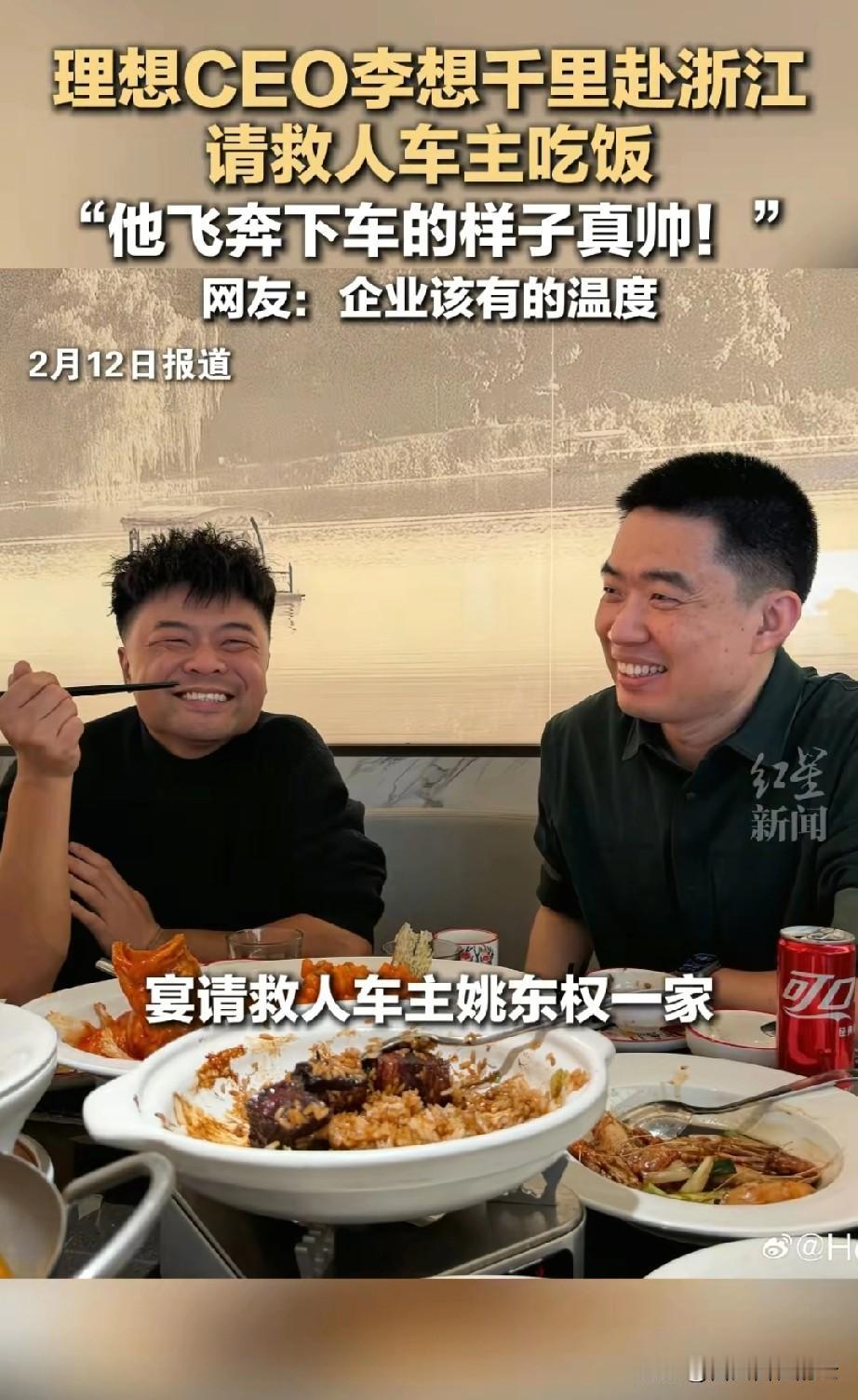 李想这人不错,说要请在大桥上救人的理想车主吃饭。这不还真来了,他知道车主的身份后,就专门从北京赶到浙江海盐,宴请了救人英雄姚东权一家。 姚东权是当地电信的一个部门经理,他说李想是他的偶像,能和李想在一起吃饭让他很兴奋。饭桌上,李想和姚东权谈笑风生,像是多年的好友。 当然李想也不是光请姚东权吃饭,他给姚东权送了眼镜,还有一个大礼,就是姚东权可以在三年内,用他的旧车在理想免费置换理想的任意车型,包括今年即将上市的l9李维斯版。 说实话理想这波操作不亏,一辆车也就几十万,可是姚东权为理想车挽回了不少形象,即使送辆车也是值得的。 对于这件事,你怎么看呢?