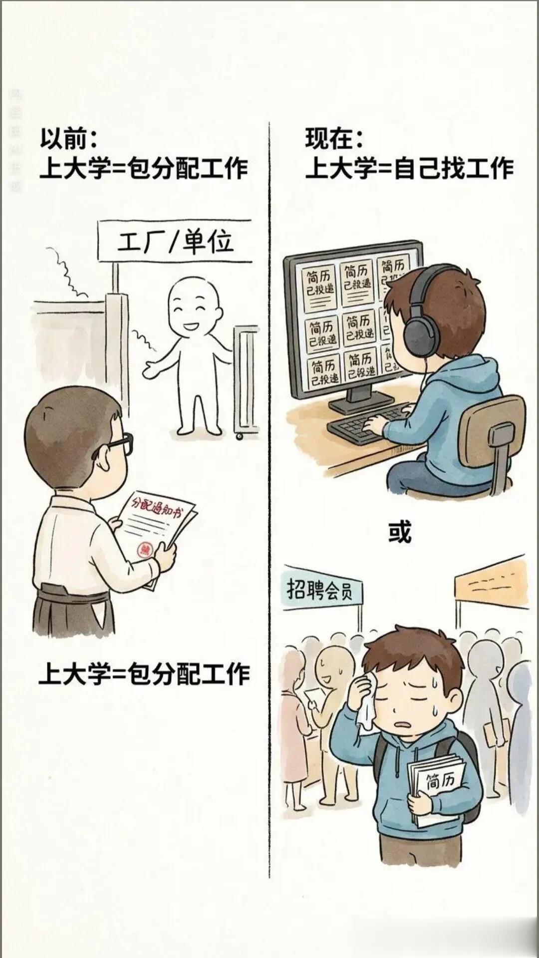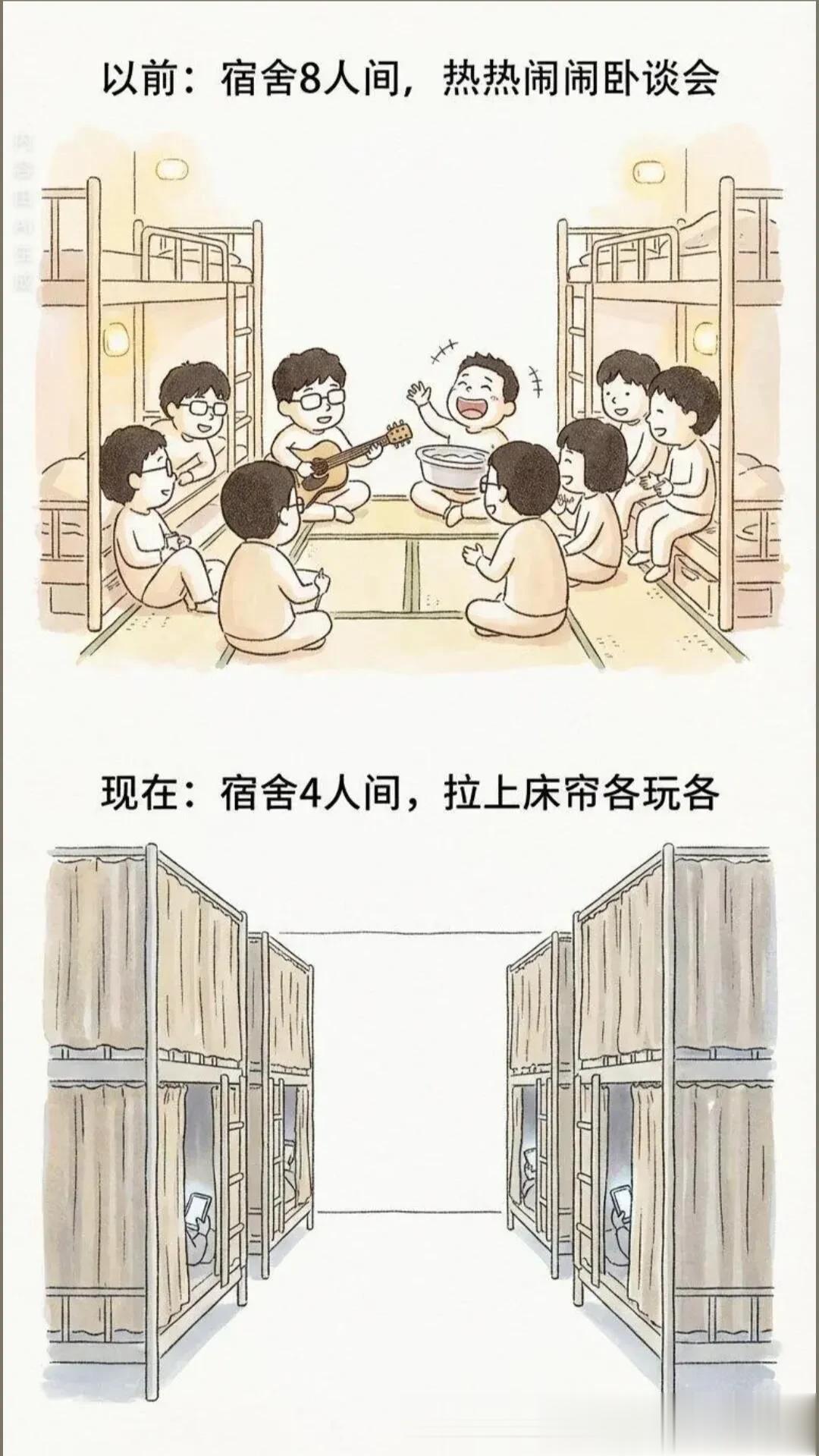 宿舍里从热闹的卧谈会,变成各自拉着床帘“闭关”,对着屏幕刷短视频、打游戏,连下楼取快递都要纠结半小时。以前盼着毕业包分配,现在挤破头投简历,还怕竞争不过“卷王”同学;以前穿校服都精神,现在卫衣拖鞋成标配,主打一个“松弛感”拉满。