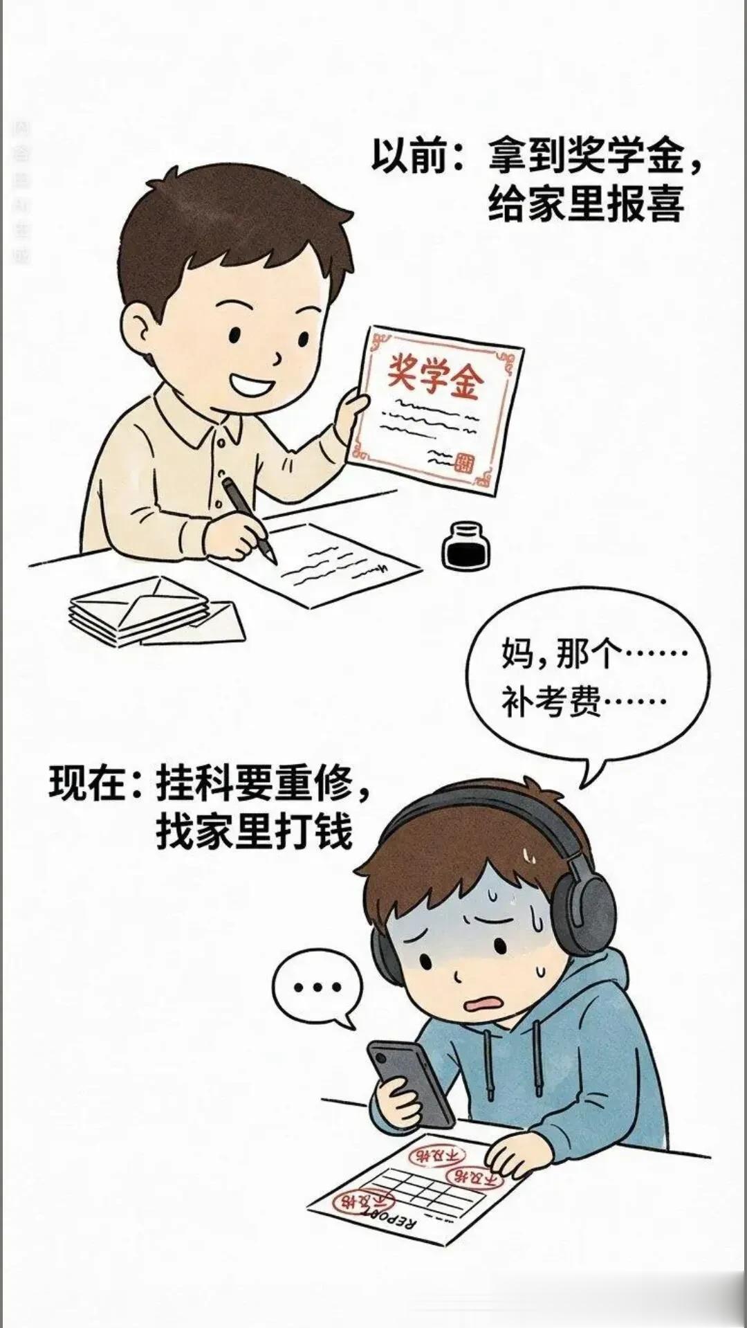 现在上大学,妥妥的“人间真实现场”。耳机一戴、手机一抱,挤在人群里蔫头耷脑,精气神直接减半。月初生活费刚到账,转眼就被奶茶、盲盒、游戏皮肤瓜分干净,月底靠着泡面续命;上课眼神黏在手机上,小组作业全靠组长硬扛,体测跑八百米喘到怀疑人生,挂科通知、房租账单成了给家里发消息的高频内容。