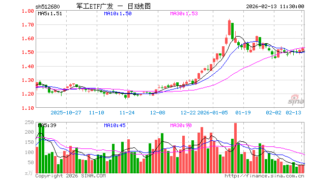 2月13日,截止午间收盘,军工ETF广发(512680)涨0.66%,报1.523元,成交额6034.53万元。军工ETF广发(512680)重仓股方面,中国船舶截止午盘涨1.66%,光启技术跌0.19%,航天电子跌0.08%,中国卫星跌0.44%,航发动力涨4.60%,中航沈飞涨1.66%,中航光电涨0.06%,航天发展涨0.77%,菲利华跌3.34%,睿创微纳涨0.94%。