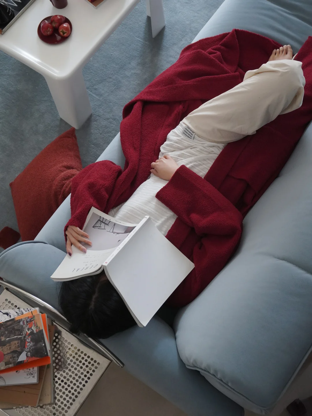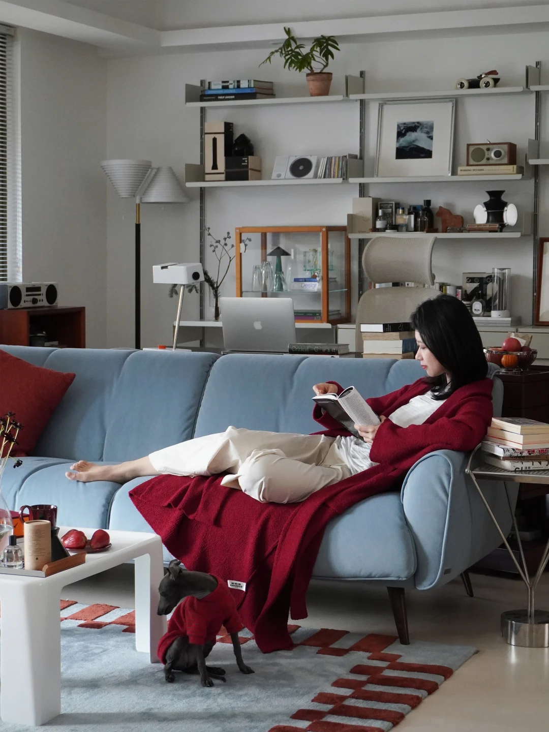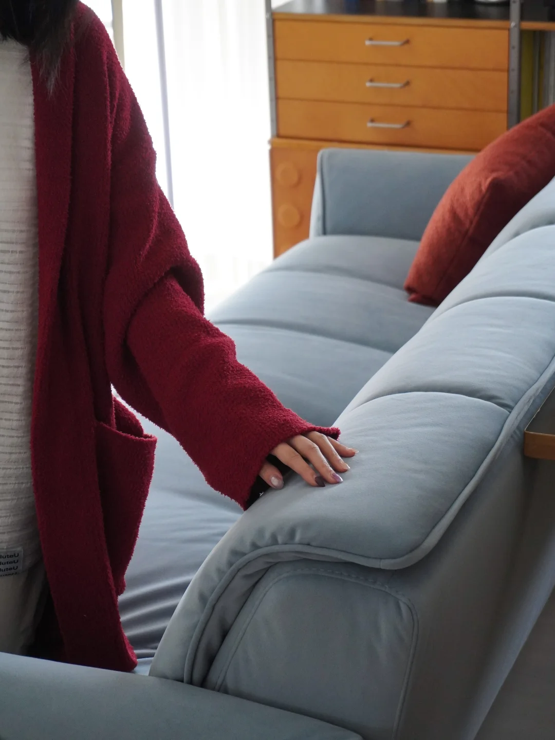 淡蓝色绒面在阳光下的流动 打造着慵懒舒适的风格 是不费心就能呈现出的温柔质感