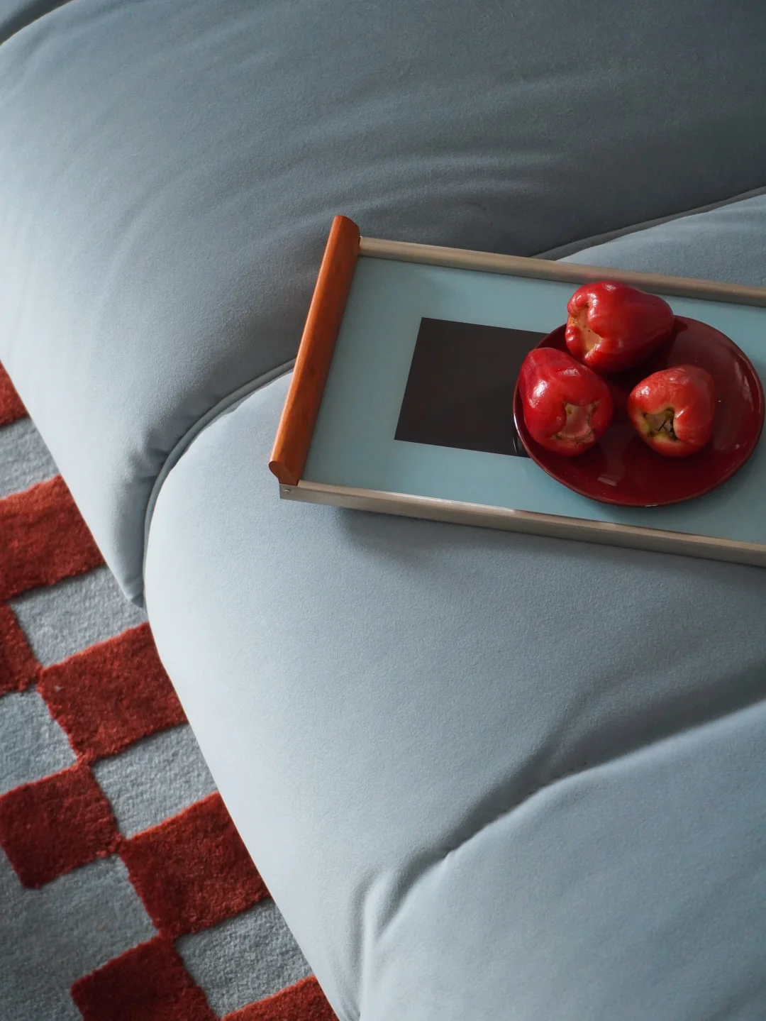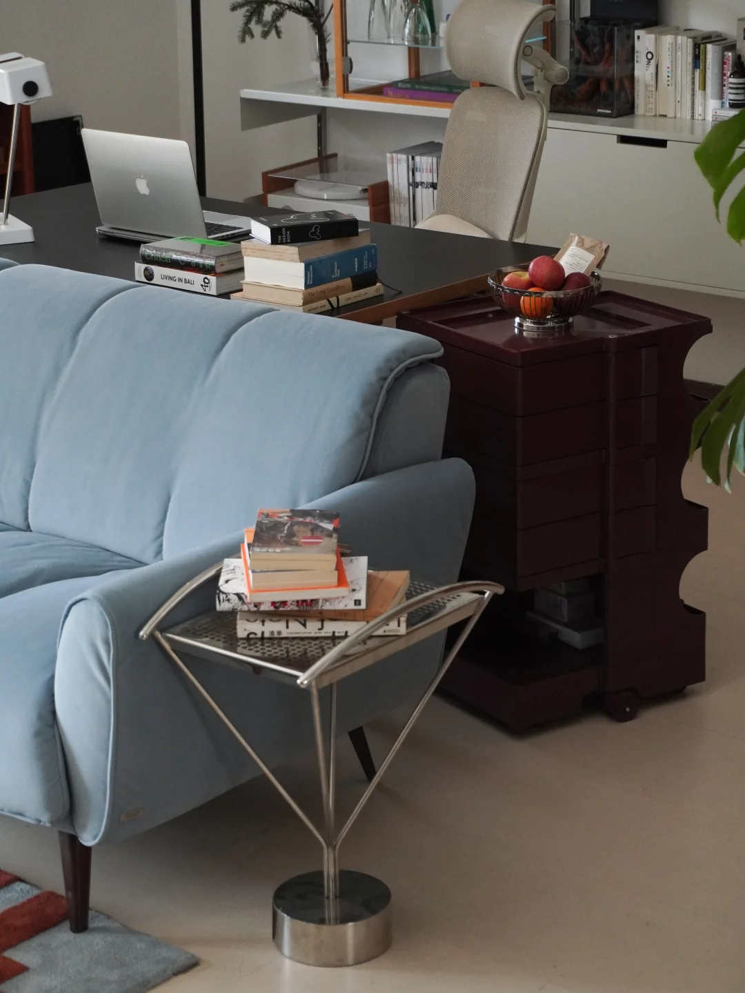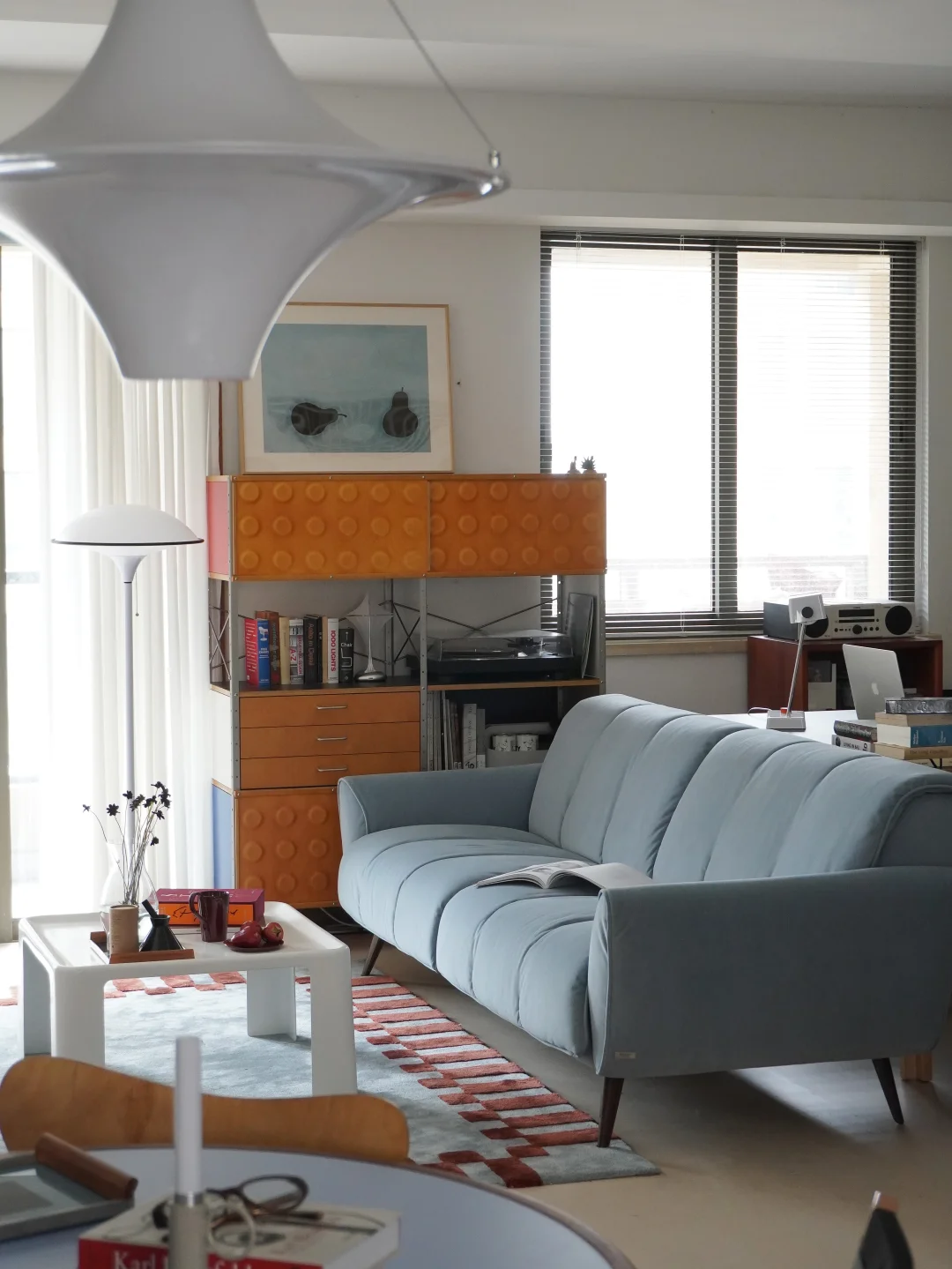 淡蓝色绒面在阳光下的流动 打造着慵懒舒适的风格 是不费心就能呈现出的温柔质感