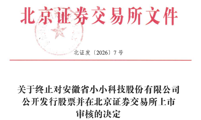 中国经济网北京2月13日讯北交所网站今日公布关于终止对安徽省小小科技股份有限公司(以下简称“小小科技”)公开发行股票并在北京证券交易所上市审核的决定。