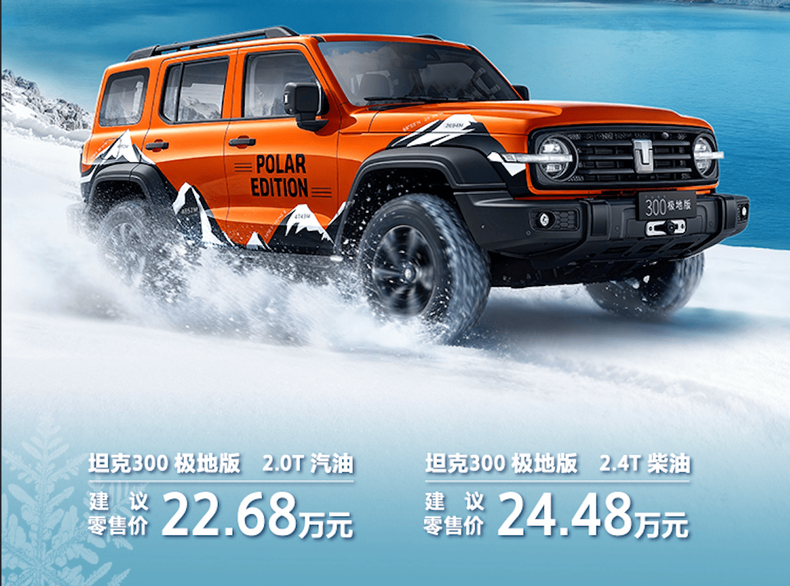 2025年12月11日,坦克300极地版正式上市,包含两款车型,售价区间22.68-24.48万元,同享梦想基金叠加新年红包礼 。该车此前已在2025广州车展首发亮相并开启预订,全球限量300辆。坦克300极地版由坦克品牌与用户共同打造,主要面向极端环境工作者以及深度越野爱好者,采用“极地橙”配色。动力上提供2.0T汽油及2.4T柴油发动机可选。