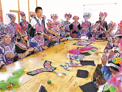 外普拉村绣娘共同交流学习彝族刺绣手工技能。外普拉村供图