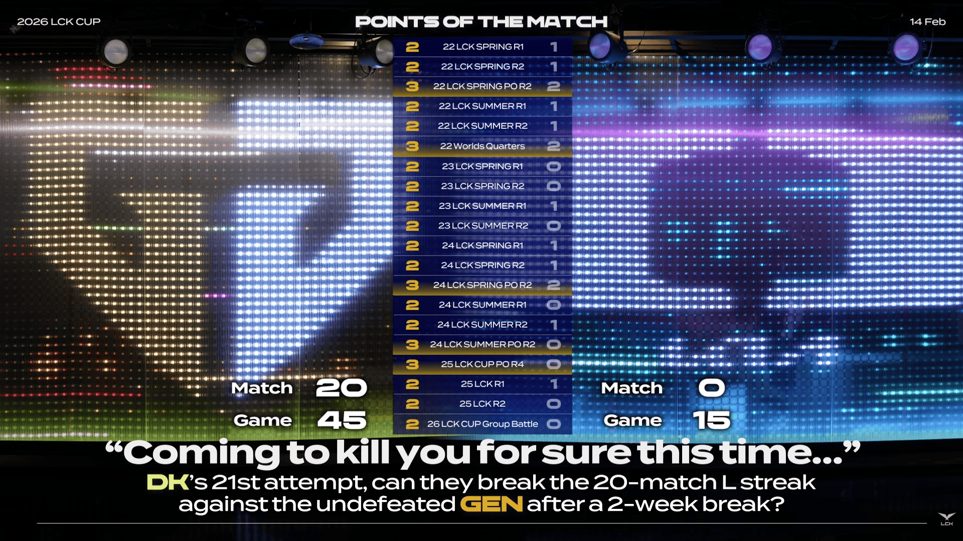 LCK官方贴出GEN和DK历史对战记录:22年起GEN大场20-0全胜