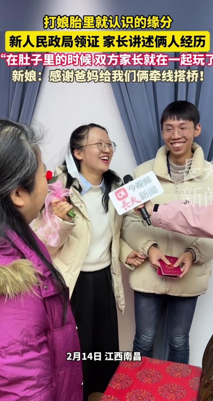 打娘胎里就认识?这对新人背后的故事,甜到让人羡慕! 你能想象吗?他们的故事从“肚子里”就开始了!刚在新人民政局领完证,两个年轻人就成了正式的夫妻。更有趣的是,双方家长感慨:其实孩子们“还没出生的时候,我们就经常在一起玩了!”这缘分,听起来就像电影里的剧情,但却是真实发生在他们身上的。 新娘激动地说:“感谢爸妈给我们牵线搭桥,让我们有机会相识相爱。”这句话背后,不只是感恩,更是对父母那份默默付出和守护的深情告白。毕竟,父母的陪伴和支持,是每段感情最坚实的底色。 双方家长也纷纷表达了对新人的祝福,希望他们能相互包容,携手走过未来的风风雨雨,幸福一生。毕竟,婚姻不是童话,但有了包容和理解,就能把日子过成甜蜜的诗篇。 这段故事让人忍不住思考,缘分到底是什么?是偶然,还是命中注定?从“肚子里”就开始的缘分,似乎在告诉我们,真正的缘分早已在生命里埋下了种子,只待时机成熟,便会开花结果。 你有没有遇到过这样的“奇妙缘分”?或者,你觉得现代社会里,爱情和缘分还有多少“命中注定”的成分?婚姻真的只靠爱和缘分就够了吗?欢迎留言分享你的故事和看法!