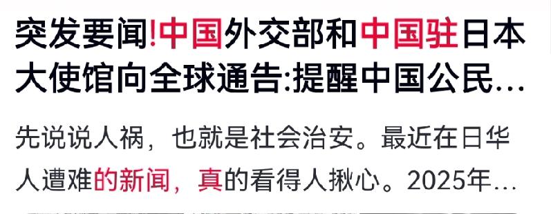 大过年的,图啥?不就图个平安团圆嘛! 可看看最近新闻,心真揪着。中国驻日领馆连发提醒,日本大阪又出砍人案,一死两伤,凶手还在逃。这可不是个例——随机伤人、街头砍人、抢劫诈骗……曾经“最安全”的日本,治安神话早就破了。 为啥?经济低迷,年轻人看不到未来,社会边缘人群增多,压抑久了,暴力就多了。更糟的是,针对中国游客和在日华人的恶性事件也在增加,维权还难。 除了治安,日本地震风险也高,救援、医疗全商业化,出了事,担惊受怕还得花大钱。再加上社会氛围右转,排外情绪抬头,华人面孔更容易成目标。 说实话,真别往外跑了,往家回! 陪父母吃顿年夜饭,跟亲戚朋友嗑嗑瓜子聊聊天,平平淡淡才是真。领馆提醒不是吓唬人,是真心为我们好。听劝,就是对自己负责。 平安,才是过年最好的礼物! 对此你怎么看?