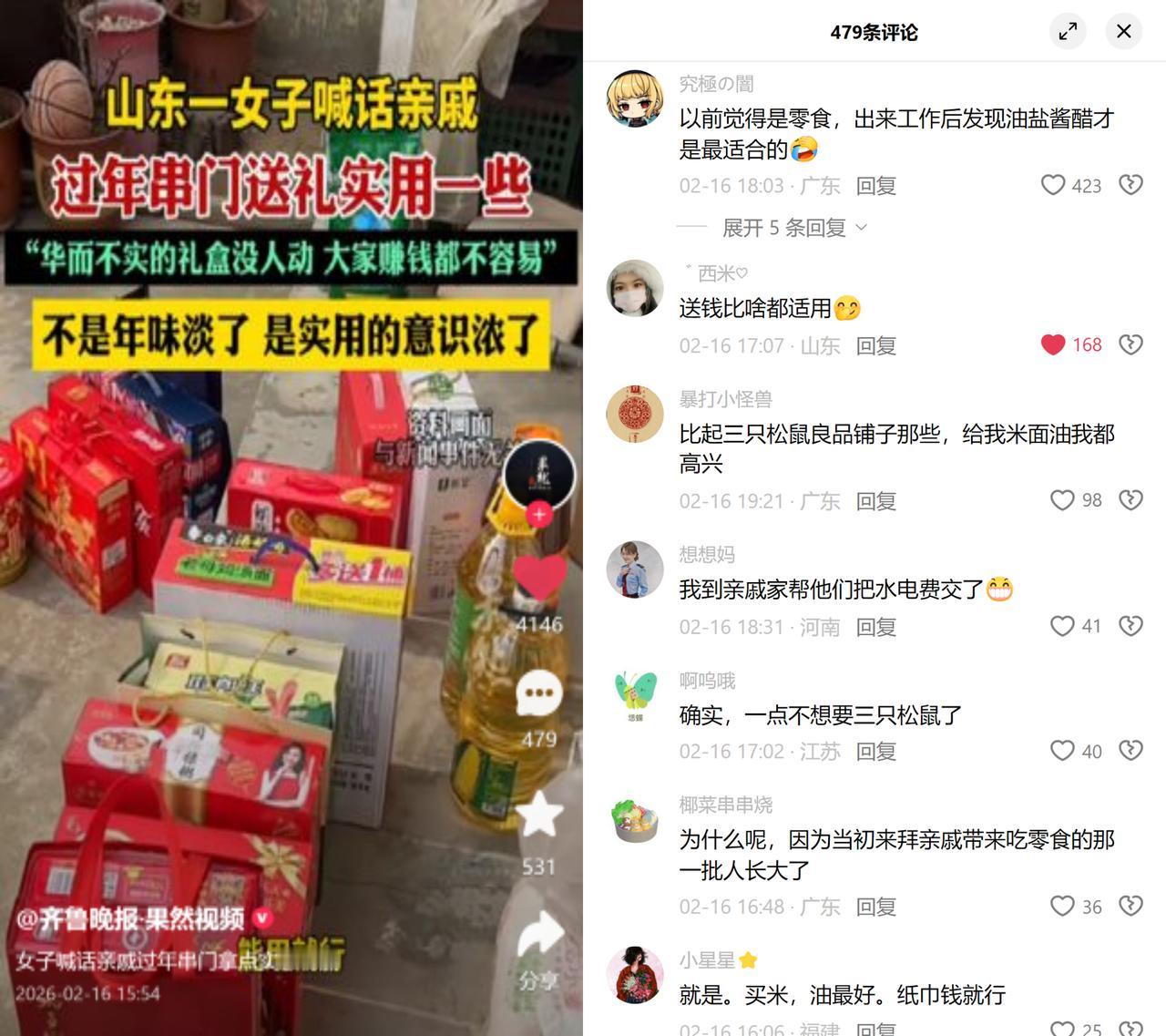 山东女子喊话:过年送礼别送花架子! 最近山东一女子发视频呼吁,亲戚过年串门别整那些华而不实的礼盒,不如送米面粮油、卫生纸这些实用的,说大家赚钱都不容易,实用比面子重要,这话瞬间说到了好多人心坎里。 以前过年追着要零食礼盒的那群小孩,现在居然开始主动要米油了! 年味没变淡,只是我们真的长大了,从被宠着要糖吃的孩子,变成了精打细算持家的大人,终于懂了柴米油盐才是日子里最实在的刚需。 就像有人说上次送土鸡蛋被嫌抠搜,转送金龙鱼油反倒被老人夸懂事;还有数据显示,今年年货节大米销量翻两倍,实用型礼品需求蹭蹭涨。 这哪里是抠搜啊?分明是我们看透了面子的虚耗,开始选择更务实的生活方式。以后拜年,送点能用得上的,比啥花架子都暖心!