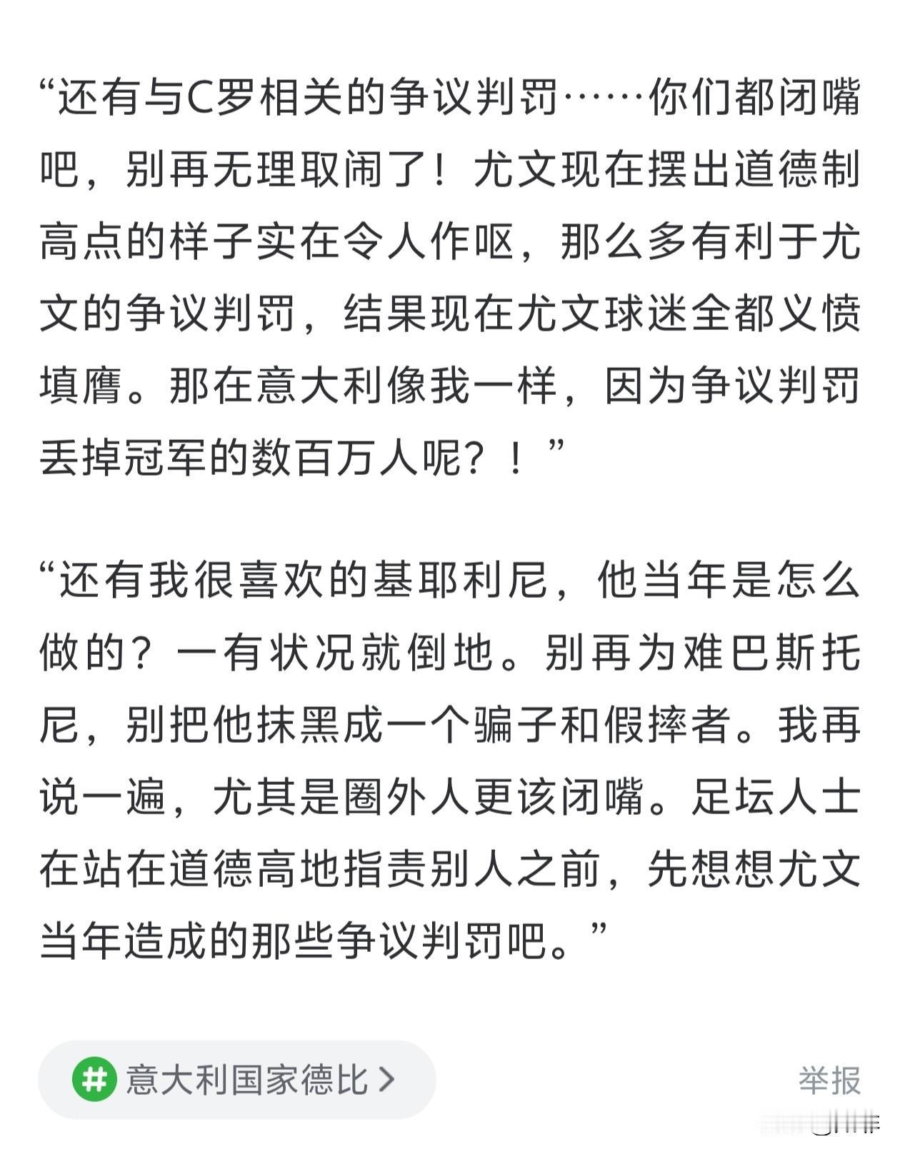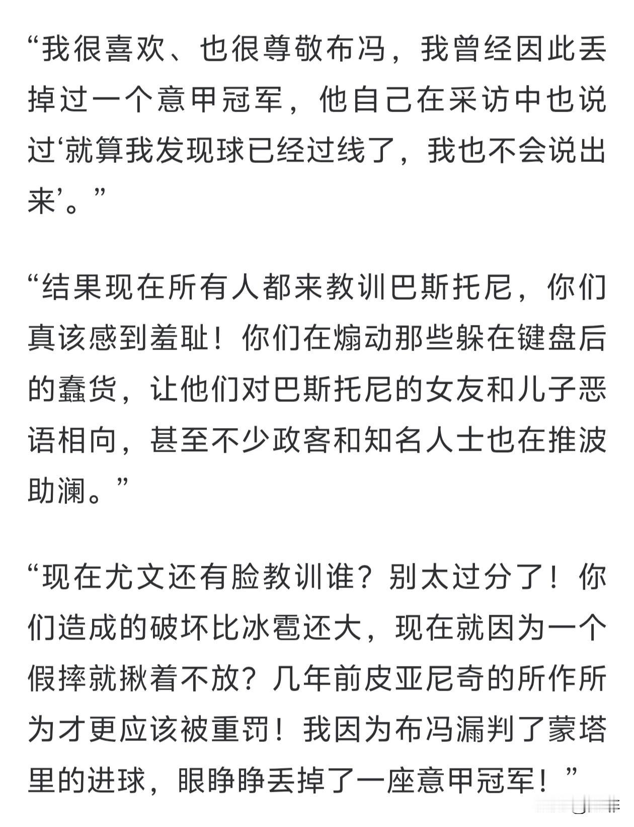 意大利德比过去两天了,媒体、名宿、球迷对巴斯托尼的讨伐甚嚣尘上。 从比赛结束的那一刻起,我就说过尤文图斯上上下下表现的有点反应过度了。而从这两天的新闻环境来看,国际米兰的确不是舆论的宠儿。 随着意大利议长,俱乐部主席马洛塔,前主席莫拉蒂的回应与反击,名宿和世界各地中立球迷的发声与支持,事件本身也在渐渐扭转和淡化。 早晨看到卡萨诺的话,卡麻子平日里疯疯癫癫,但在大是大非面前从不含糊。这个网暴事件已经超越了足球本身,如果非要上升到道德高度的话,首先要接受审判的,一定不是巴斯托尼。 国内球迷也都吵翻了天,骂骂咧咧的诅咒对方阵营的一切。看意甲的中国球迷,都不是什么年轻人了,过年聚会喝点小酒开开心心不好吗?捧个手机跟别人骂来骂去,幼稚的让人笑话。