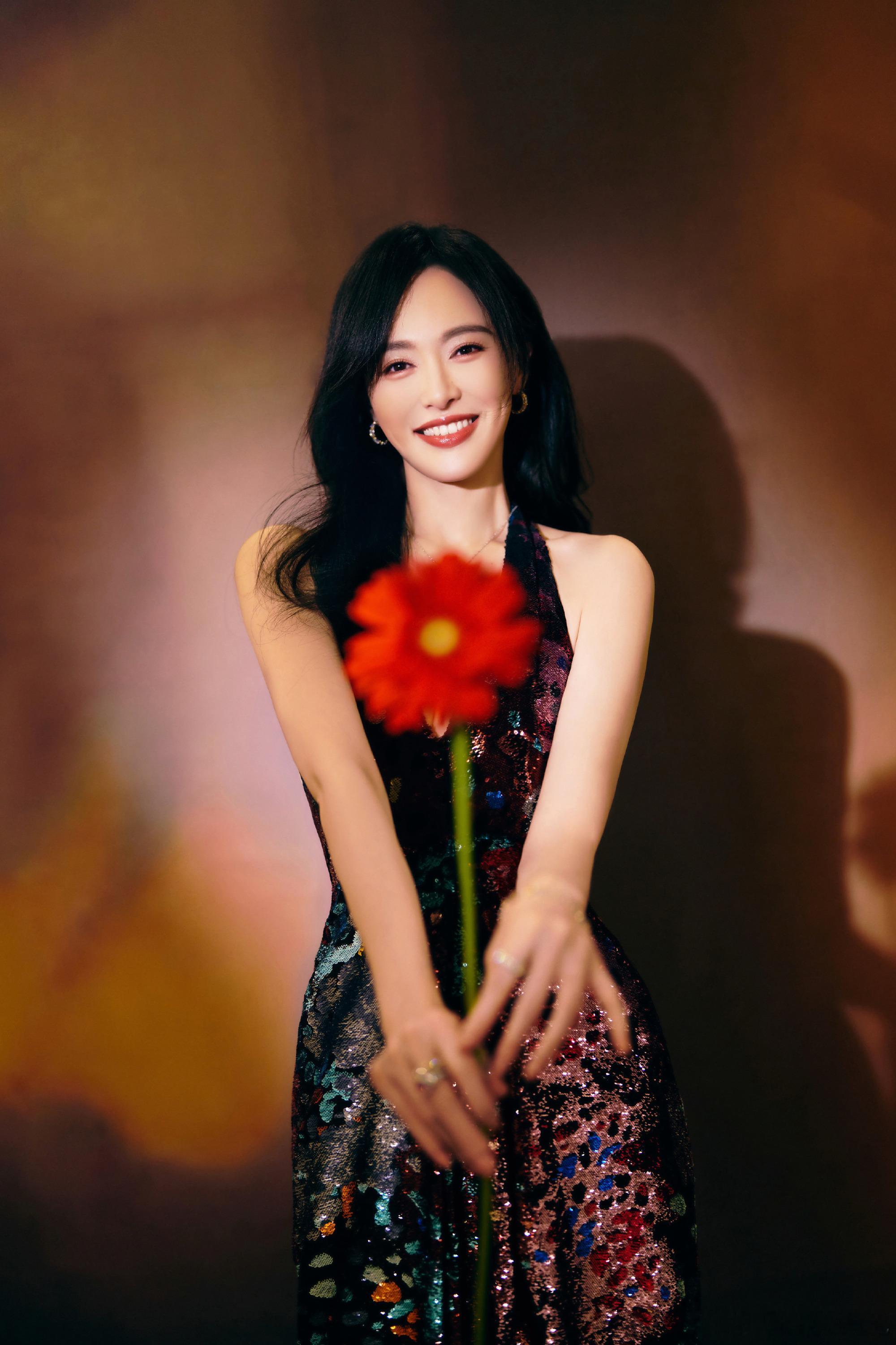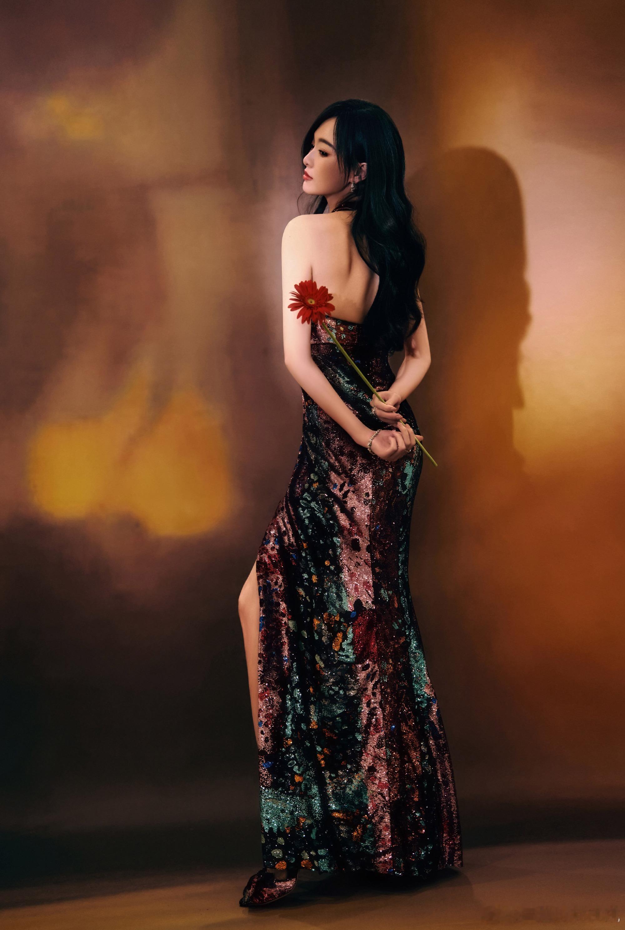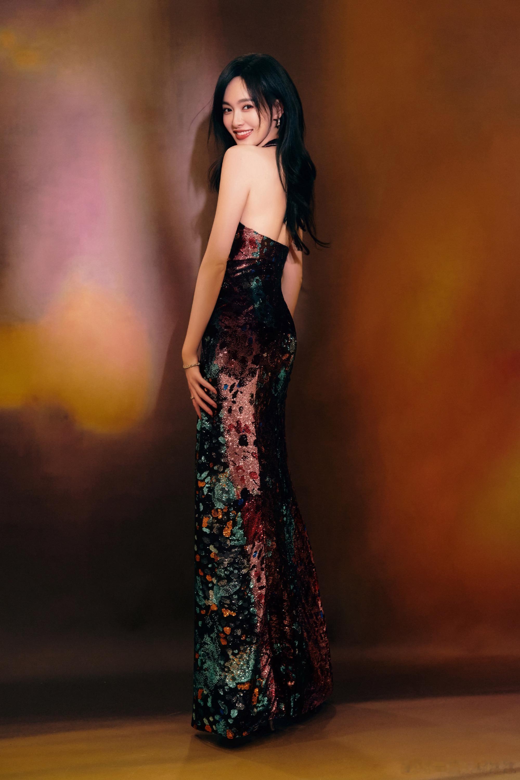 梅婷盘气质头发一袭银色亮片露腰款连衣裙,美的如此高级优雅