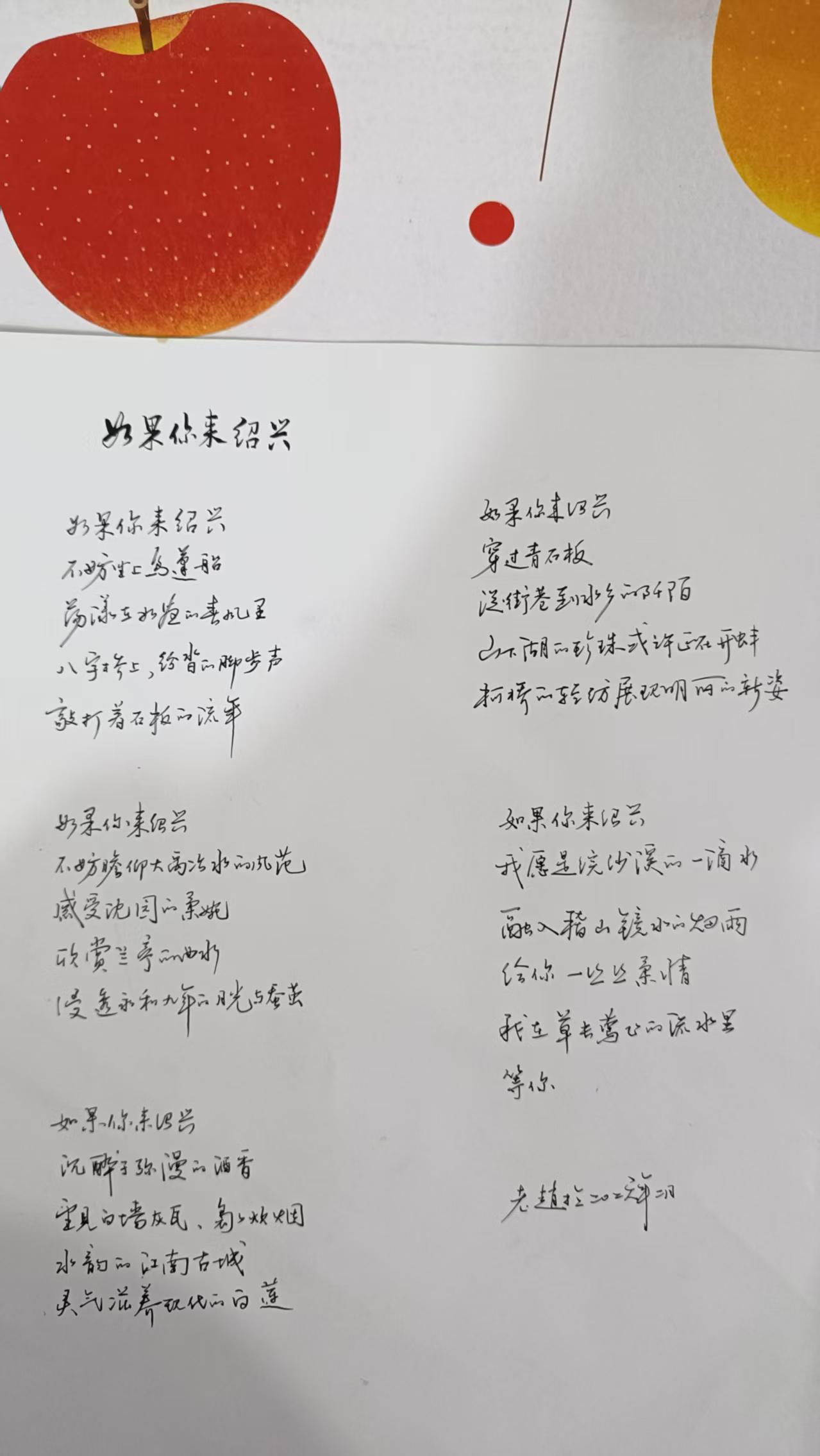 店主老赵,一位钟情于诗歌创作的水果摊主,也是越牛诗友会的成员,在2026年农历新年前夕,再次提笔,以一首《如果你来绍兴》的诗篇,为水乡古城送上了充满柔情与烟火气的新春祝福。