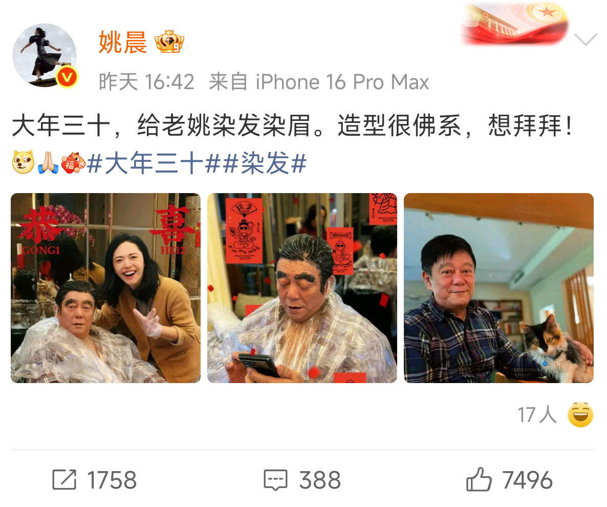姚晨除夕给爸爸染发染眉姚晨回福建老家过年了 姚晨回福建老家过年啦除夕夜给爸爸染发染眉,染完后姚晨还调侃爸爸新造型看起来很佛系,咱就说好温馨幸福的家庭氛围呀~祝大家新年快乐啦~
