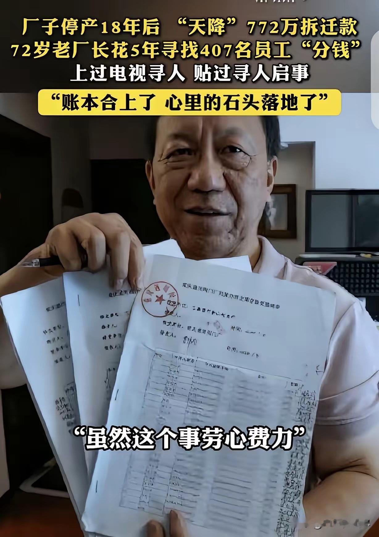 “这做人杠杠的!”重庆,一72岁老厂长,厂子停产18年后,突然厂子拆迁,获赔772万拆迁款,老厂长花5年,寻找散落各地的407个员工,甚至上电视寻人,终于把钱都分了下去,老厂长:账本合上了,心里的石头落地了。 一笔意外到来的拆迁款,让一位七旬老人用五年时光,完成了一场跨越山海的诚信托付。在重庆,72岁的老厂长郭重智,面对停产18年的老厂房换来的772万元补偿款,没有丝毫私心, 而是执着寻找散落各地的407名员工,把每一分钱都交到曾经并肩奋斗的老同事手中,用最朴素的行动,守住了一代人的情义与良心。 这家承载着无数人青春的老厂,在时代发展中渐渐停下脚步,停产之后员工各奔东西,厂房闲置多年,彼此断了联系,很多人早已远赴他乡,甚至失去音讯。 谁也没有想到,沉寂多年的老厂房迎来拆迁,一笔772万元的补偿款就此落地,因工厂账户早已注销,这笔钱最终打到了作为最后一任厂长的郭重智账户上。 面对这笔足以改变生活的巨款,郭重智没有半点犹豫,心里只有一个念头,这笔钱是全体老员工的共同所得,必须一分不少地分到每个人手里。 为了找到失联多年的老员工,郭重智翻出厂里留存多年的两麻袋工资台账与职工档案,一页页核对信息,一笔笔整理名单,最终确定了407名需要分配补偿款的员工。 这些人分布在不同城市,有的年事已高,有的搬迁多次,联系方式早已失效,寻找难度远超想象。 已经年过七旬的郭重智,没有被困难吓退,牵头成立分配小组,和几位老同事一起踏上寻人之路。 五年时间里,他跑遍重庆各个区县,远赴周边省市,靠着老旧地址和零星线索挨家挨户打听,遇到信息中断的情况,就主动联系社区、寻求媒体帮助,甚至登上电视节目公开寻人,只为不落下任何一个人。 过程中难免遇到质疑与不解,也有沟通中的摩擦,但郭重智始终坚持公平公正的分配原则,按照台账记录逐一核算,不偏不倚,让每一位老员工都能安心领到属于自己的份额。 2026年1月16日,最后一批补偿款顺利发放完毕,当最后一笔19万余元分发到员工手中,郭重智轻轻合上陪伴自己五年的账本,压在心底五年的石头终于落地。 五年的奔波,五年的坚守,从整理档案、寻找人员、制定方案到逐一分发,他把每一个环节都做得细致周全,没有辜负老同事的信任,也没有辜负自己身为厂长的责任。 从青春年少到满头华发,郭重智把最美好的时光奉献给工厂,也把最珍贵的诚信留给了一起奋斗过的伙伴。 没有惊天动地的誓言,没有刻意渲染的举动,只是凭着一份良心、一份担当,完成了这场长达五年的温暖托付,让停产多年的老厂,在最后时刻留下了最动人的温度。 对此,你们有什么看法,欢迎评论留言~