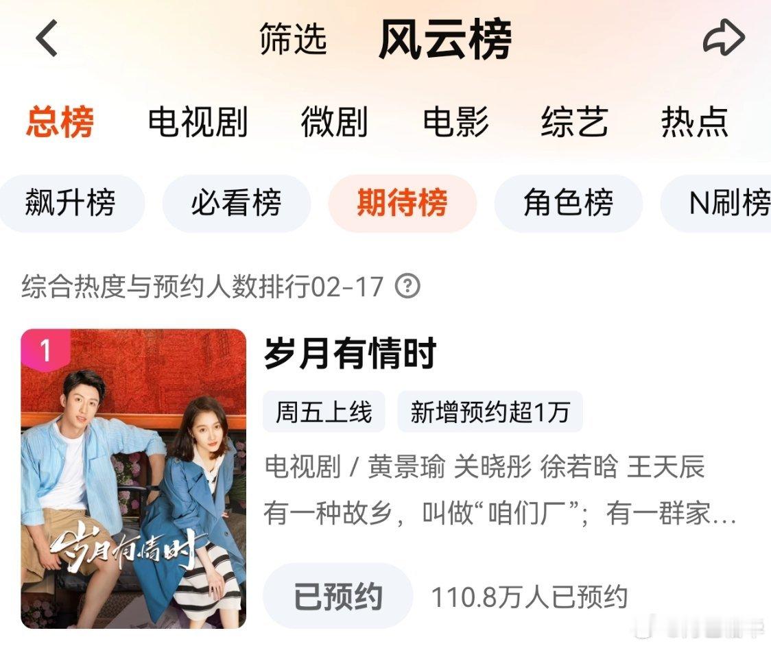电视剧岁月有情时黄景瑜张小满 预约破110万。