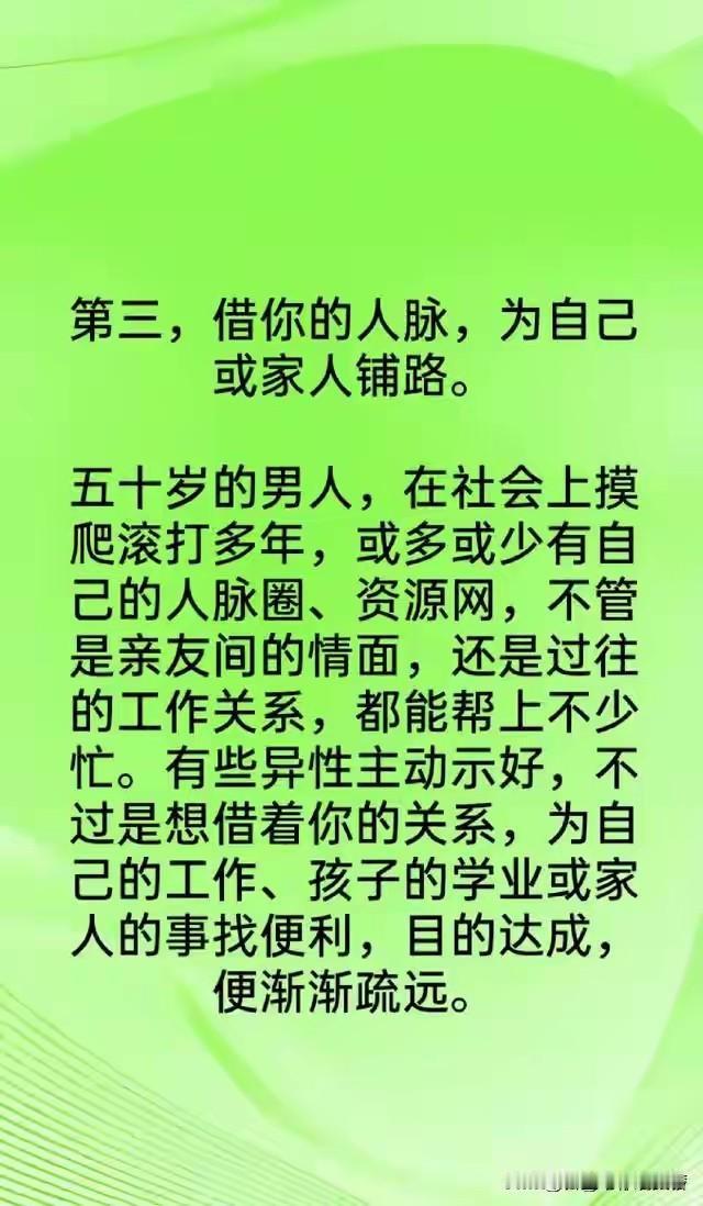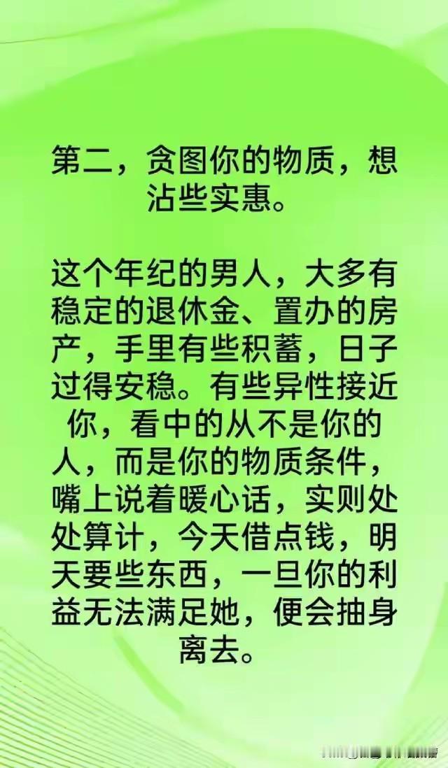 男人过了五十岁,仍有异性主动接近! 无外乎图片里的几个主要目的。 其一,或许是盯上了你的钱财。五十岁的男人打拼了半辈子,不少人都积累了一定的物质基础。有些异性靠近你,就是冲着你的钱来的。她们在日常相处中,可能会有意无意地让你为其消费,让你送贵重礼物、承担高额开销。比如,带你去高档餐厅,点些价格不菲的菜品,看似是在享受生活,实则是想掏空你的钱包。 其二,是想借助你的人脉。五十岁的男人在社会上摸爬滚打多年,通常都有人脉资源。有些异性接近你,是想通过你结识更多有价值的人,为自己的事业或生活提供便利。她们可能会频繁邀请你参加各类社交活动,在活动中不断让你为她们介绍人脉。 其三,也许只是单纯想寻求情感寄托。这个年纪的男人,历经风雨,有着成熟稳重的魅力。有些异性感情生活不如意,就会被你身上的特质所吸引,想从你这里获得情感上的关怀与支持。不过,这种情况较为少见,而且要仔细分辨对方是否真心。 所以,五十岁之后若有异性接近你,一定要保持清醒,别被表面现象迷惑,看清对方的真实目的,以免惹上不必要的麻烦。
