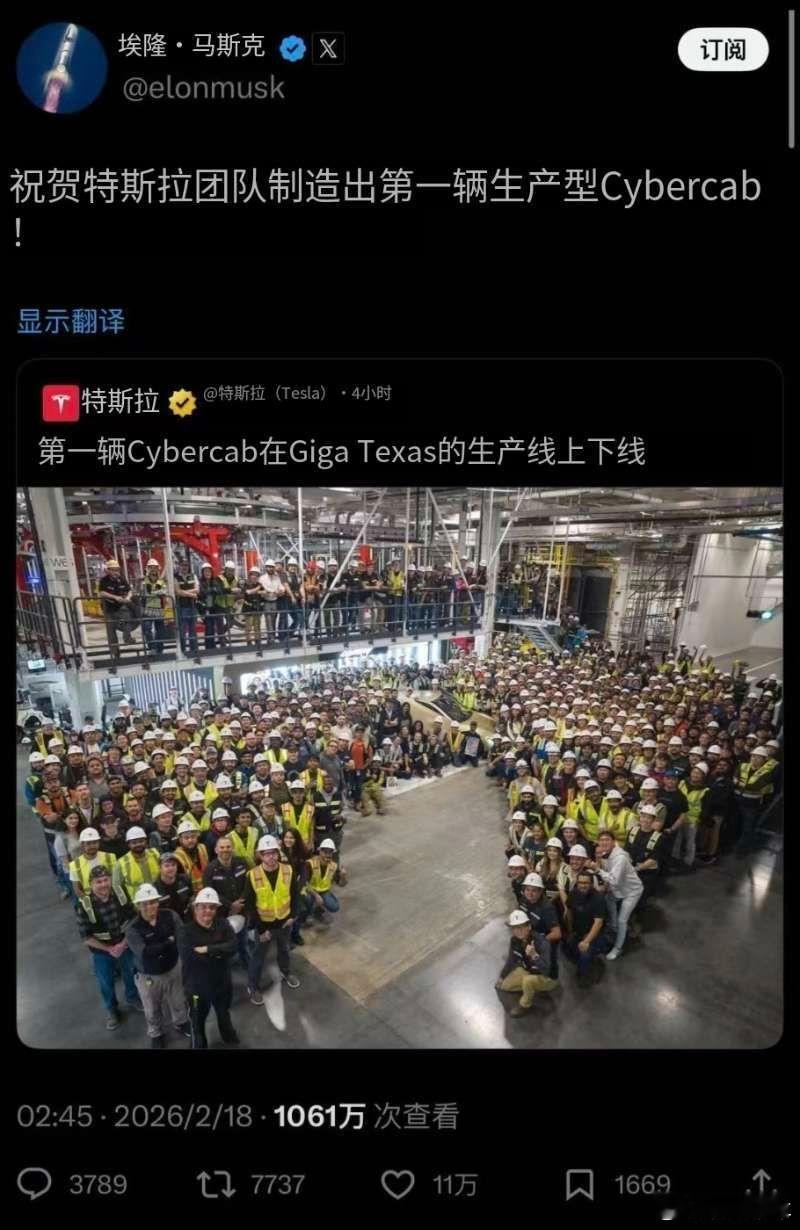 【特斯拉Cybercab已正式开启量产】2月18日,首辆特斯拉Cybercab赛博无人驾驶电动车在美国得克萨斯州超级工厂正式下线。该车为无方向盘、无踏板的纯电无人驾驶车型,定位面向共享出行与Robotaxi场景,计划于今年4月启动量产,目标年产能约200万辆。