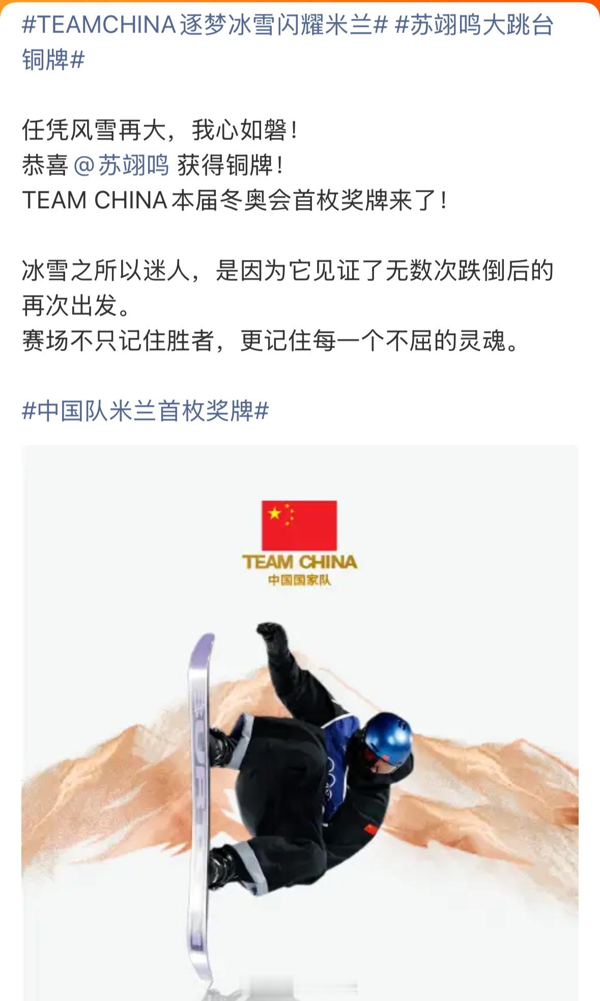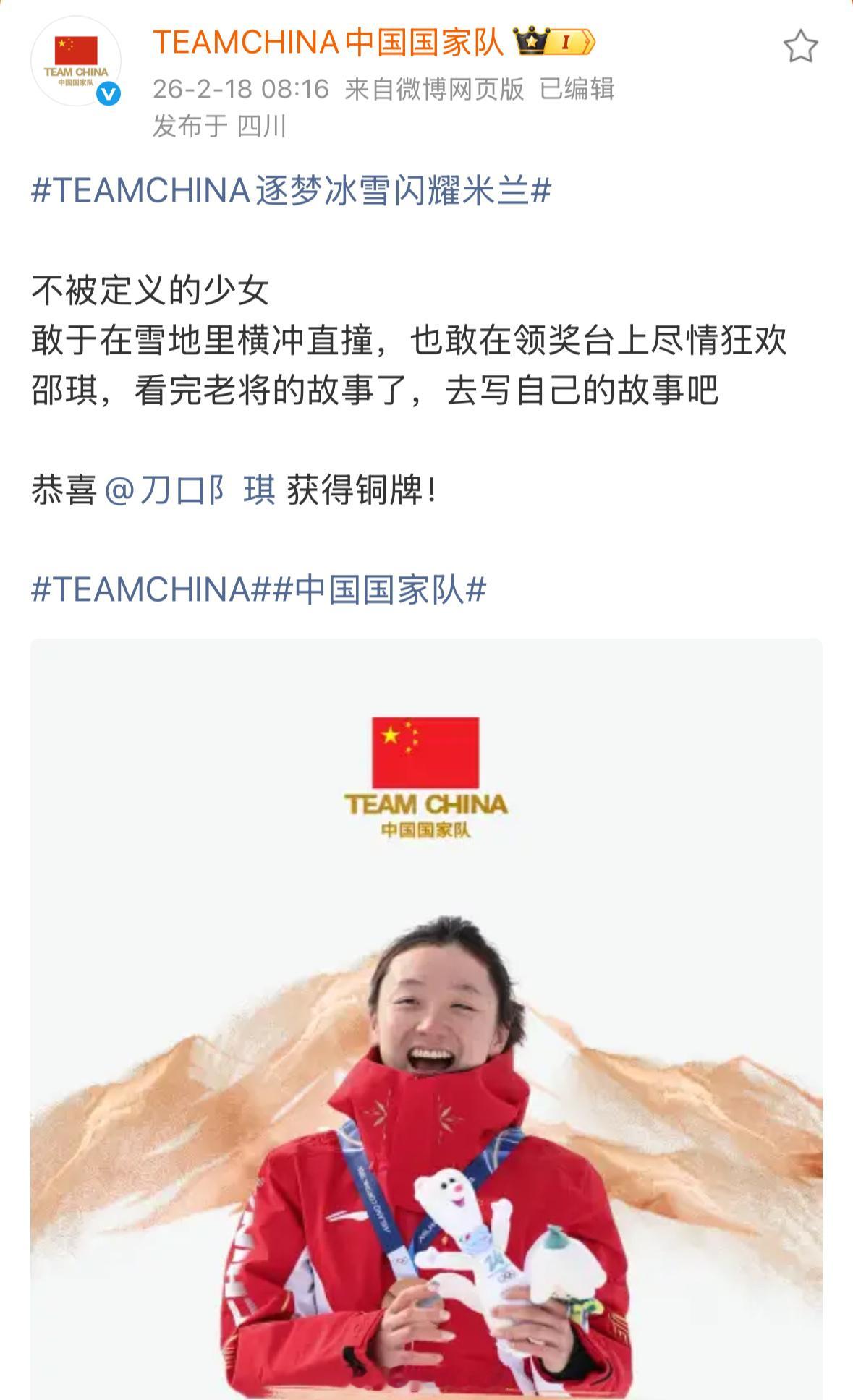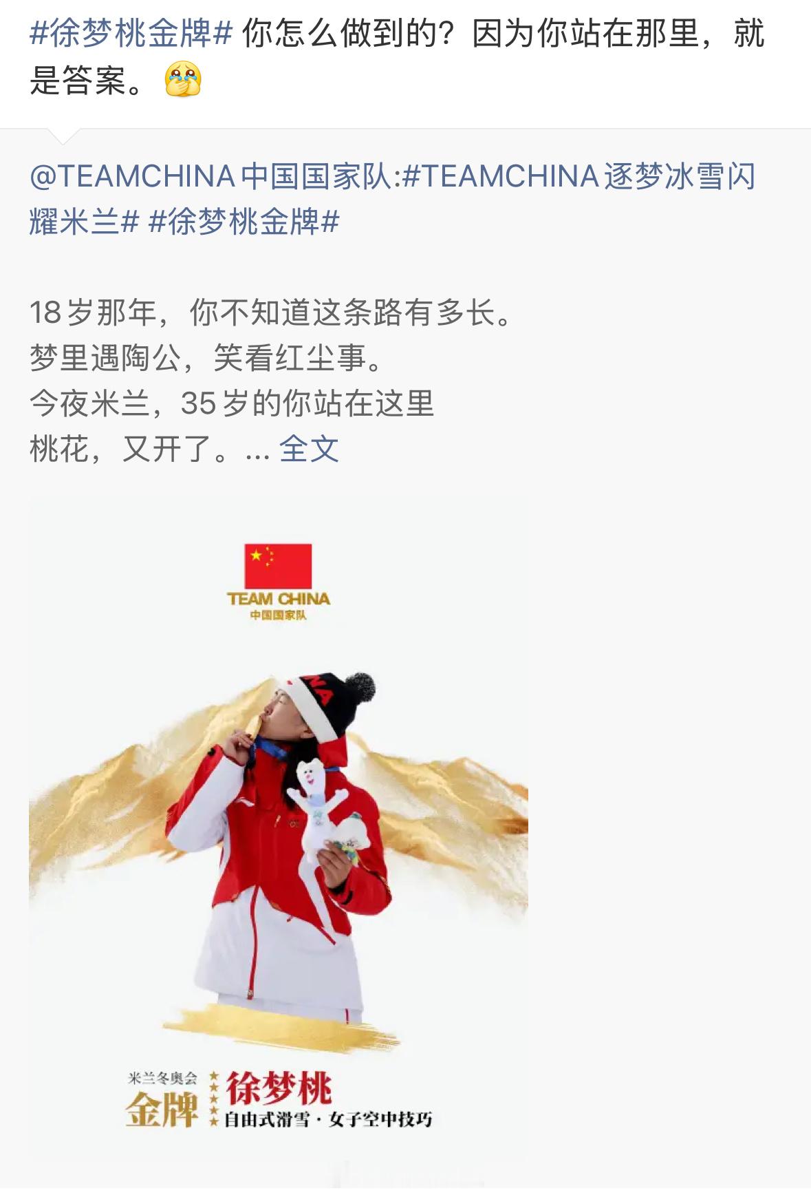 这个中国国家队官博真的太会写文案了写徐梦桃:“18岁那年,你不知道这条路有多长…桃花,又开了”写范可新:“在冰面写满年轮的人,比任何人更懂得残酷的凛冽和热爱的体温”写谷爱凌:“重力向下,而你向上。世界标注象限,你定义自己的中央”写隋韩:“画会卷起来,但山不会倒…来时路远,幸有冰如镜…原来圆满可以有很多种”