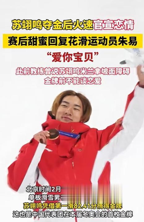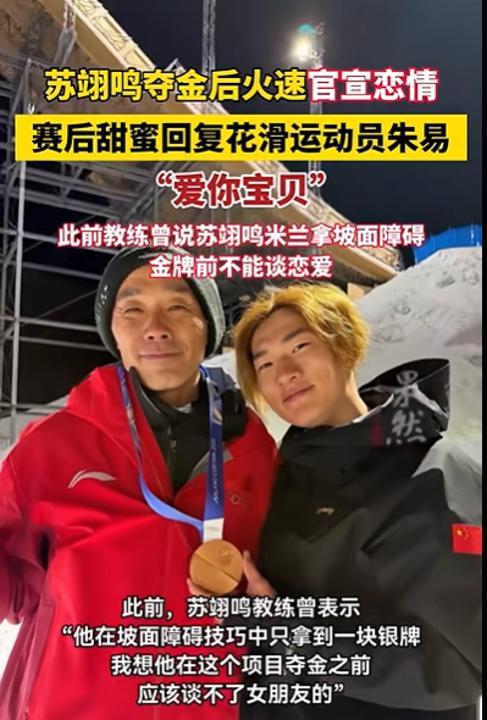 此前,苏翊鸣教练曾表示,“他在坡面障碍技巧中只拿到一块银牌,我想他在这个项目夺金之前应该谈不了女朋友的。”