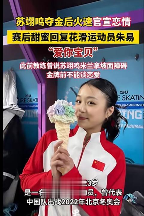 恰逢苏翊鸣22岁生日,中国花样滑冰运动员@朱易在社媒发布合影官宣恋情并祝贺苏翊鸣。