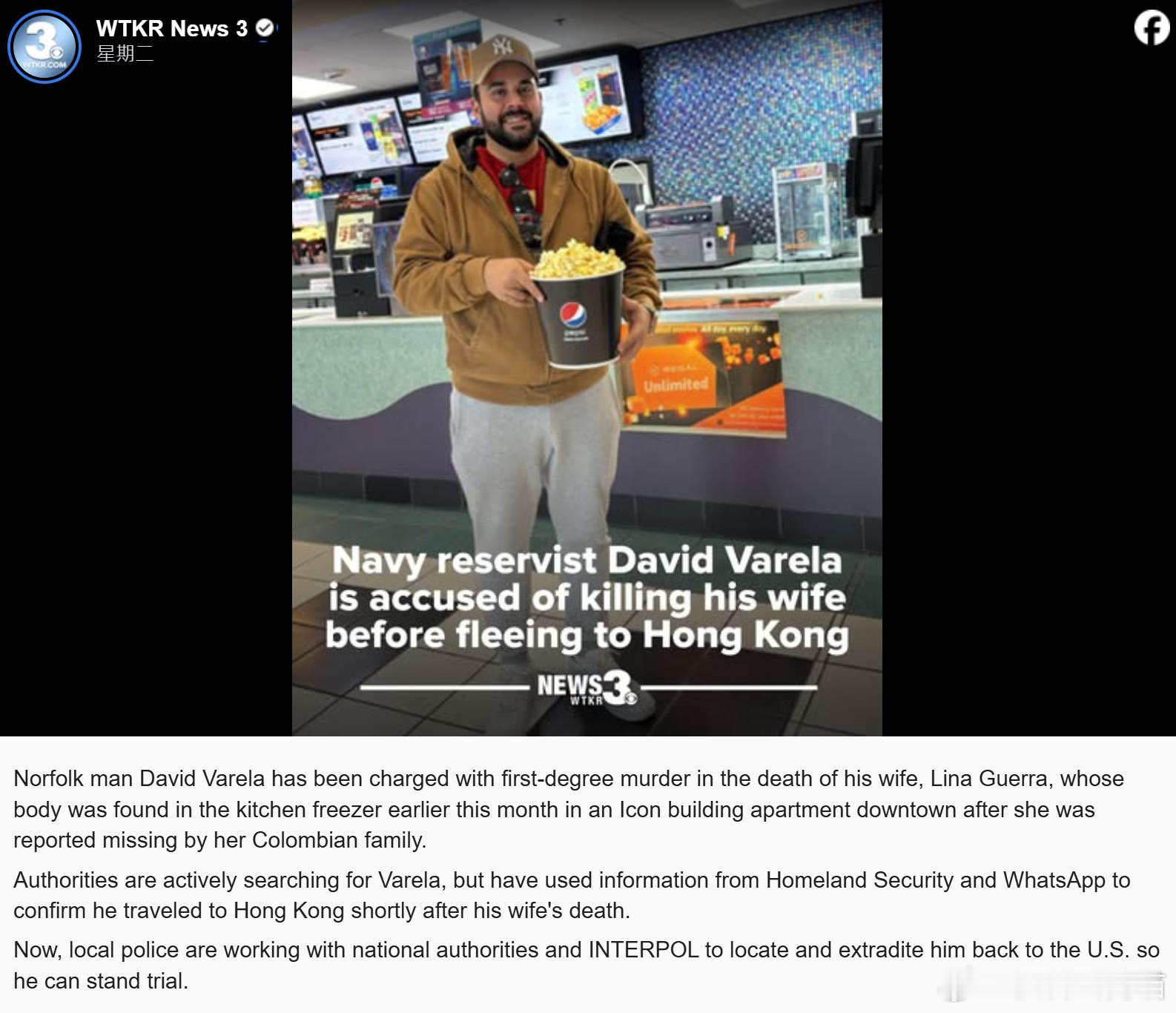 美国38岁男子David Varela涉嫌杀害39岁的妻子Lina Guerra。警方本月初在其住所冰柜内发现女方遗体,随后以一级谋杀罪对其提起指控。据多家美媒2月18日援引联邦文件报道,Varela目前下落不明,调查人员发现他于2月5日前后乘机前往香港。