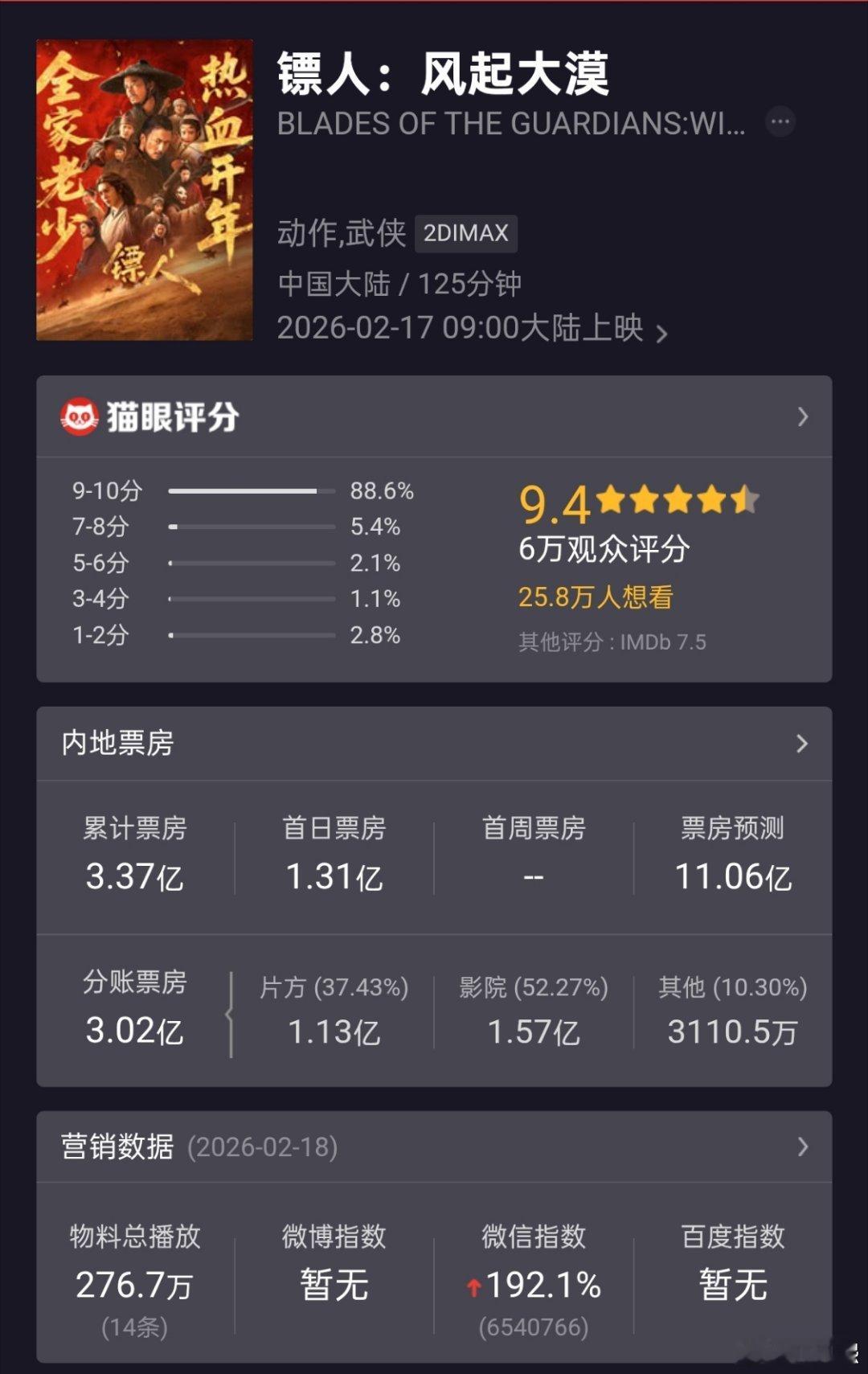 这也是2026春节档六部国产电影中第一部实现逆跌的影片。在《飞驰人生3》《惊蛰无声》《熊出没》《熊猫计划》《星河入梦》普遍回落的情况下,《镖人》率先逆跌,彻底让今年春节档迎来变数与看点。逆跌之后排片有望继续上调,票房走势持续走强,反超势头明显。你觉得,《镖人》内地最终票房会超过哪几部?用智搜高效搞定春节观影用智搜高效过大年镖人票房逆跌