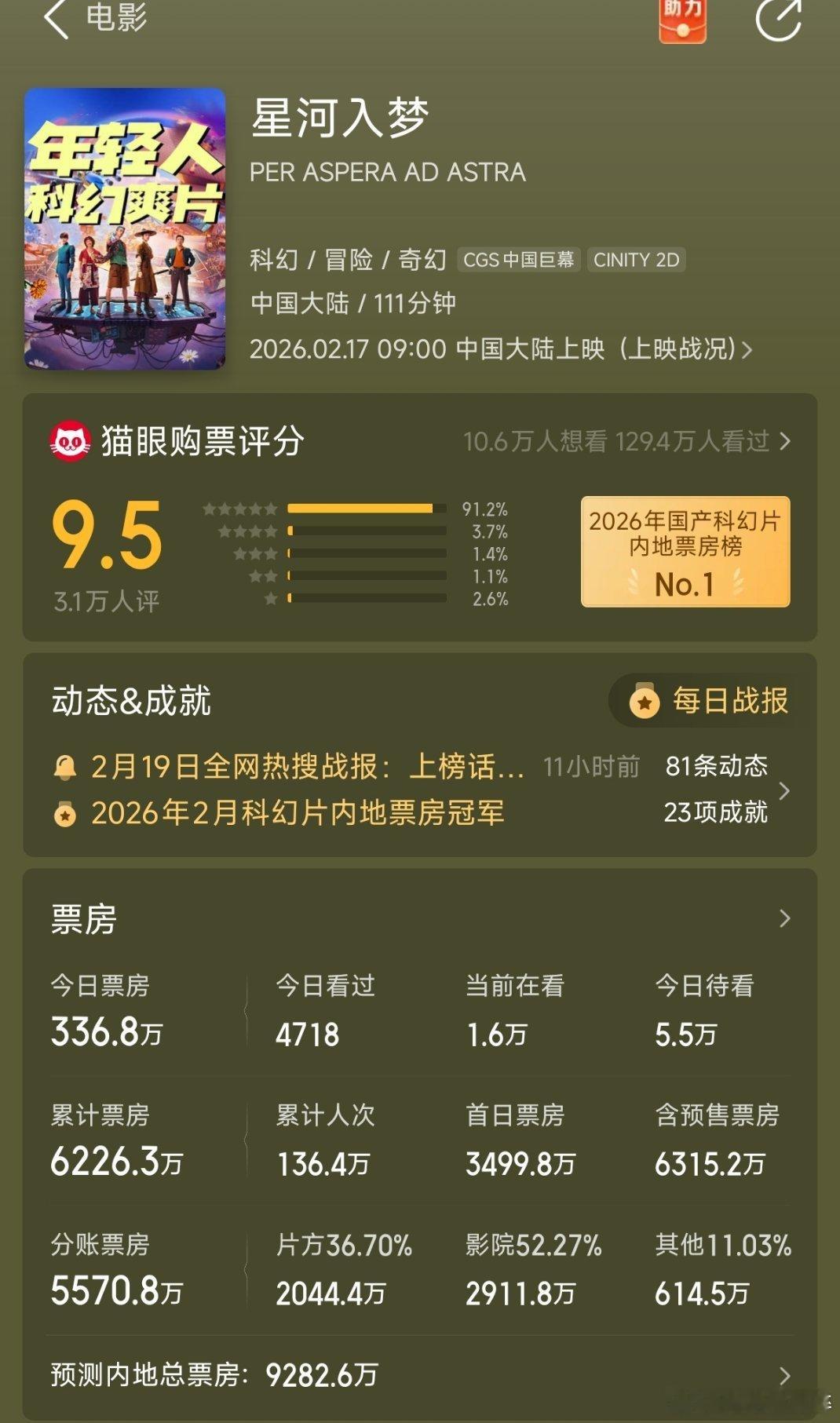 星河入梦预计票房已经降到9282万了难怪昨天恳求多加点场只能说还是不能盲目挤入春