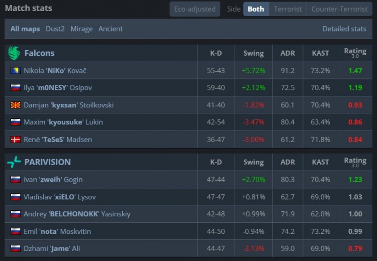 易边再战,猎鹰拿下手枪局后,孩神两回合五杀,猎鹰连拿2分将比分扩大至10-5。第16回合KK拿到Niko掉的AK回敬四杀吹响PV反击号角,PV连拿3分,比分来到10-8。第19回合K3在A下包与尼尼孩孩守包成功拿到第11分,随后zweih两回合连续双杀,PV连追两分,zweih再与KK双人五杀,双方11-11战平。