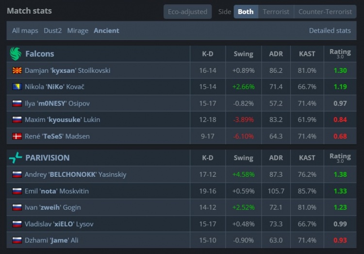 第10回合,xiELO回防A点爆轰三杀联手zweih打赢2v4残局拿到PV第2分。次回合Niko单人破B手撕zweih,猎鹰拿到第9分。半场结束前,zweih与xiELO双人五杀守A,PV以3-9结束上半场。