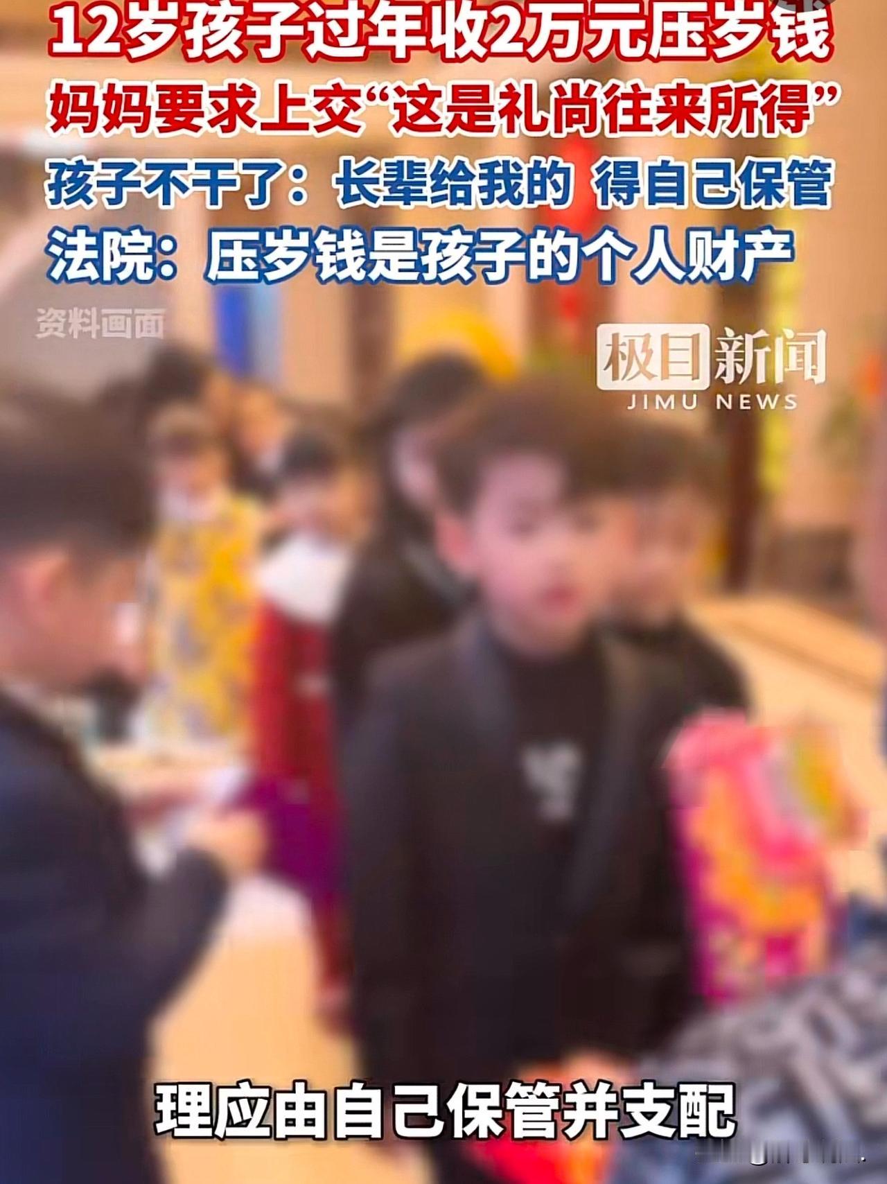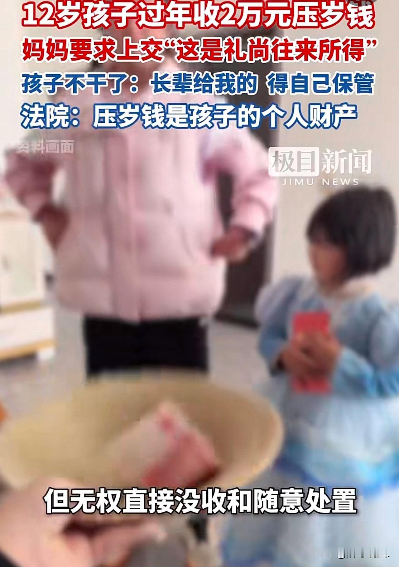 12岁孩子,从长辈处收到2万余元压岁钱,还没揣热乎呢,妈妈就要求他上交。孩子说这