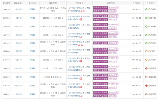 【10年前的丰田卡罗拉遭车主集体投诉:仪表台老化出油反光 不安全】快科技2月22日消息,第三方汽车投诉平台车质网显示,一汽丰田卡罗拉近期遭到车主们的集体投诉,投诉原因多为仪表台老化开裂、出油反光,影响驾驶安全。