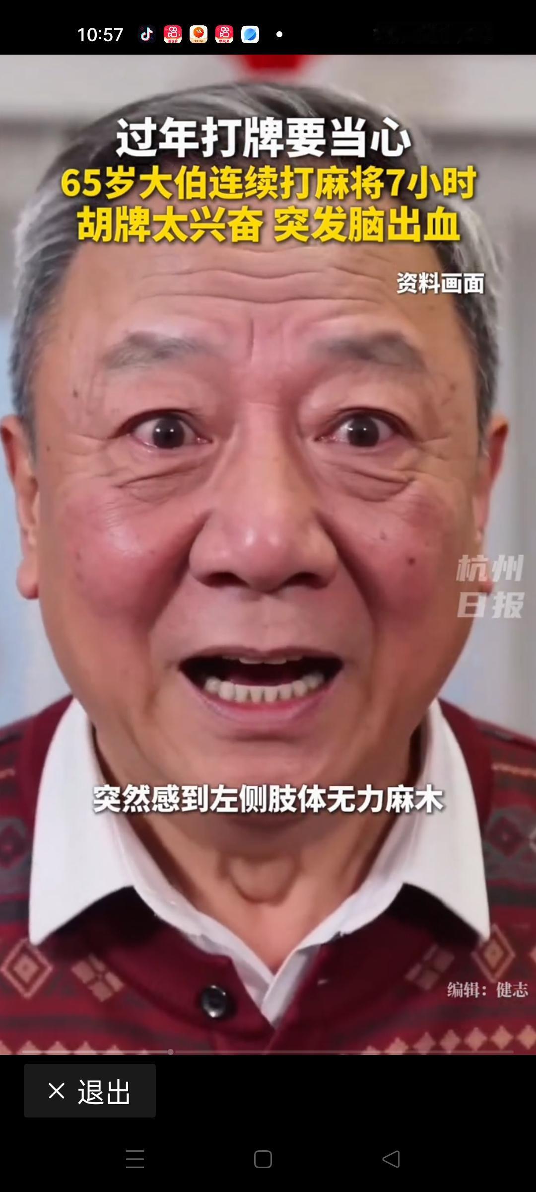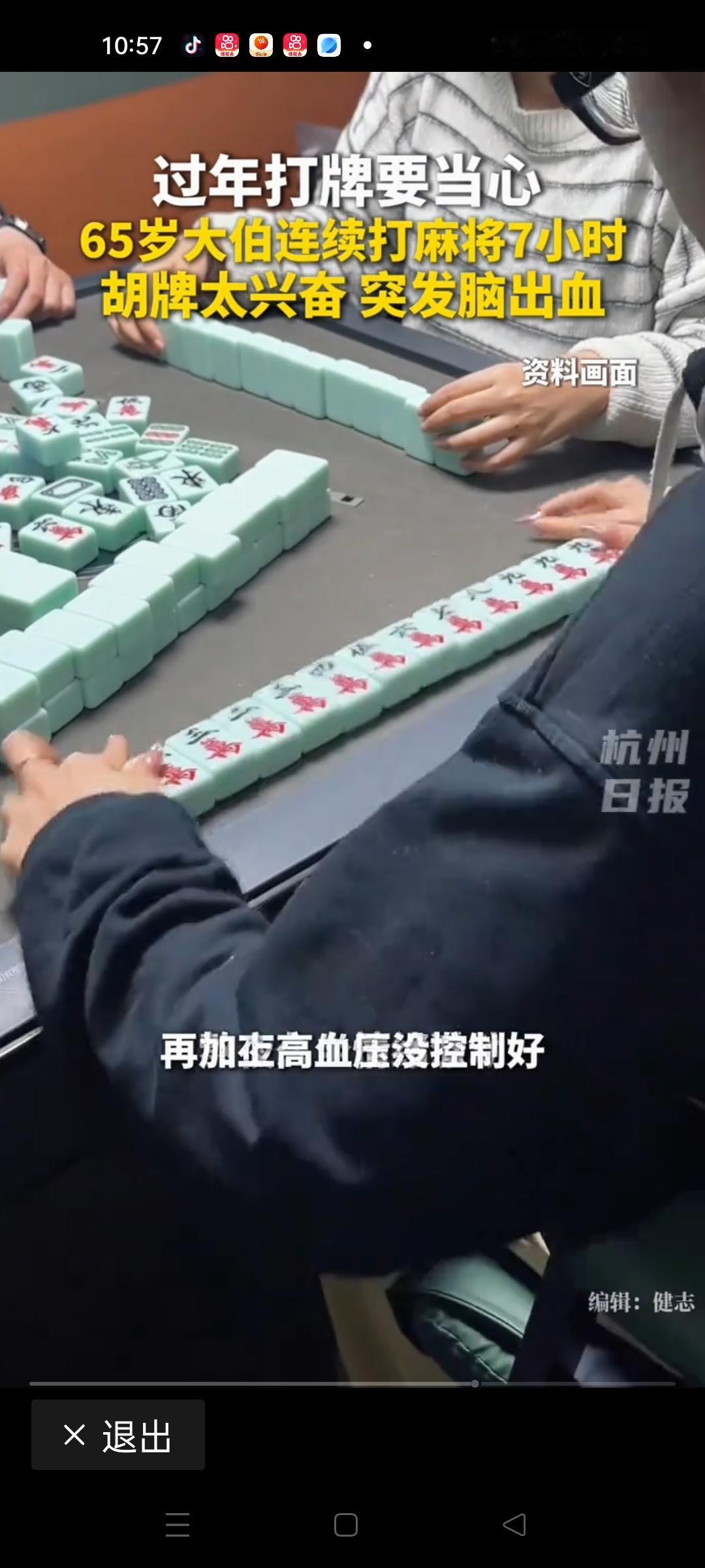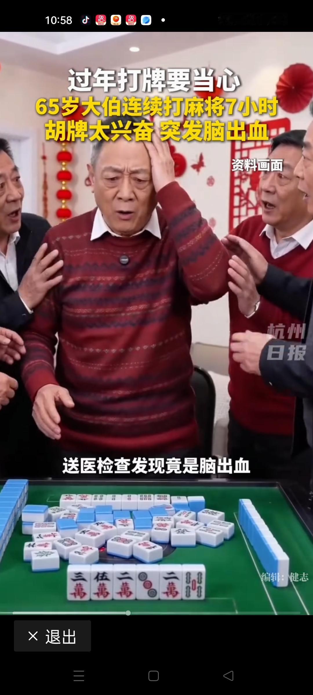 男子打麻将胡牌兴奋过度引发脑出血,这一新闻一经曝光,立刻在网络上引发了轩然大波。麻将,这项陪伴了无数人无数个夜晚的传统娱乐活动,本该是轻松愉快的消遣,怎么会变成了“致命的陷阱”? 其实,这背后反映的远不止一个人的悲剧。麻将桌上那份“赢了就赚了,输了就算了”的心态,早已被“赌徒心理”悄然取代。胡牌那一刻的兴奋,仿佛赢得了全世界,但这份情绪的极端波动,却可能让身体付出惨重代价。人的情绪与生理是密不可分的,过度兴奋导致血压骤升,血管承受不住压力,脑出血的风险就此骤然升高。 更令人深思的是,现代社会快节奏生活带来的压力,让越来越多的人选择麻将作为“解压神器”。可你有没有想过,这种“解压”方式是否真的健康?在麻将桌上,输赢牵动着每个人的神经,兴奋、失落、焦虑、愤怒交织,情绪起伏之大,远超普通的休闲娱乐。特别是中老年人,血管弹性减弱,一旦情绪激动,极易引发心脑血管疾病。 这起事件提醒我们,娱乐不能盲目追求刺激,健康才是第一位。我们需要重新审视自己对麻将、对娱乐的态度:是为了放松身心,还是为了追逐一时的快感?当兴奋成为危险的信号,当快乐变成负担,我们是否应该停下来,给自己和家人一个健康的未来? 网友们纷纷留言,有人感慨:“麻将虽好,可别拿命去赌!”也有人吐槽:“这年头,连打个麻将都成了高风险运动?”这些声音折射出大众对健康生活的渴望和对过度娱乐的警惕。 那么,如何才能既享受麻将带来的乐趣,又避免悲剧重演?或许,控制情绪、适度娱乐、关注身体信号,是我们每个人都该学会的“必修课”。毕竟,生活不只是赢一把牌,更是要赢得健康和幸福。 这起事件,不只是一个个案,更是对我们每个人的警示。麻将桌上的欢笑,不能成为生命的代价。愿每一位热爱生活的人,都能在娱乐中找到真正的快乐,而不是隐患。你怎么看?你有没有在麻将桌上经历过类似的情绪波动?欢迎留言分享你的故事,让我们一起探讨,如何让娱乐更健康、更有意义。打麻将中风 脑出血