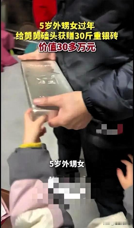 山东舅舅醉酒送30斤银砖,磕头就给!退还后再送压岁银,这才是亲情最好的样子 山东临沂这段视频,这两天真的刷爆了全网,看完心里又暖又感慨。 事情很简单:2月21日晚上,舅舅喝完酒兴致上来,直接抱出一块足足30斤重的大银砖,对着5岁的小外甥女说,磕个头就送给你。小朋友也实在,跪下认认真真磕了头,舅舅当场就把银砖递了过去,场面看着又搞笑又暖心。 后来家人一算,这块银砖价值三十多万,实在太重了。虽说舅舅是真心疼外甥女,可这么贵重的礼物,孩子太小根本不懂其中分量,收下了不仅给舅舅添负担,更怕让孩子从小养成“伸手就要贵重礼物”的习惯。一家人商量后,连夜联系舅舅,第二天一早就原封不动把银砖还了回去。 本以为这件事就这么结束了,没想到暖心的反转还在后面。没过几天,舅舅又特意托人送来一块小银块,上面刻着“压岁钱”三个字,几十克重,价值一千多块,不多不少,心意满满。 说实话,看完整个事情,我真的特别有感触。 很多人羡慕外甥女有这么大方的舅舅,可我觉得,最难得的不是那块30万的银砖,而是家人之间的分寸感和清醒。舅舅疼孩子是真的,不掺一点假;姐姐一家不贪不占,懂得拒绝过重的礼物,更是难得。 亲情最珍贵的地方,从来不是多少钱、多贵重的礼物,而是恰到好处的疼爱,和不越界的真心。大银砖退回去了,但刻着“压岁钱”的小银块,反而更有温度,更像过年该有的样子。 现在这块小小的银砖摆在孩子书桌上,比起三十万的重物,它更像一份稳稳的祝福,也给很多家庭做了最好的示范:宠爱可以很足,但分寸不能少;亲情可以很浓,但不能被金钱绑架。 这才是春节最该有的压岁钱,也是最舒服的亲人相处方式。山东临沂舅舅送银砖 最暖心压岁钱